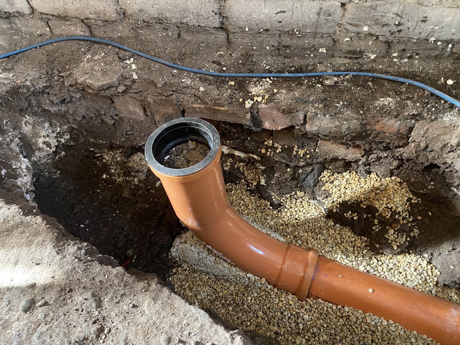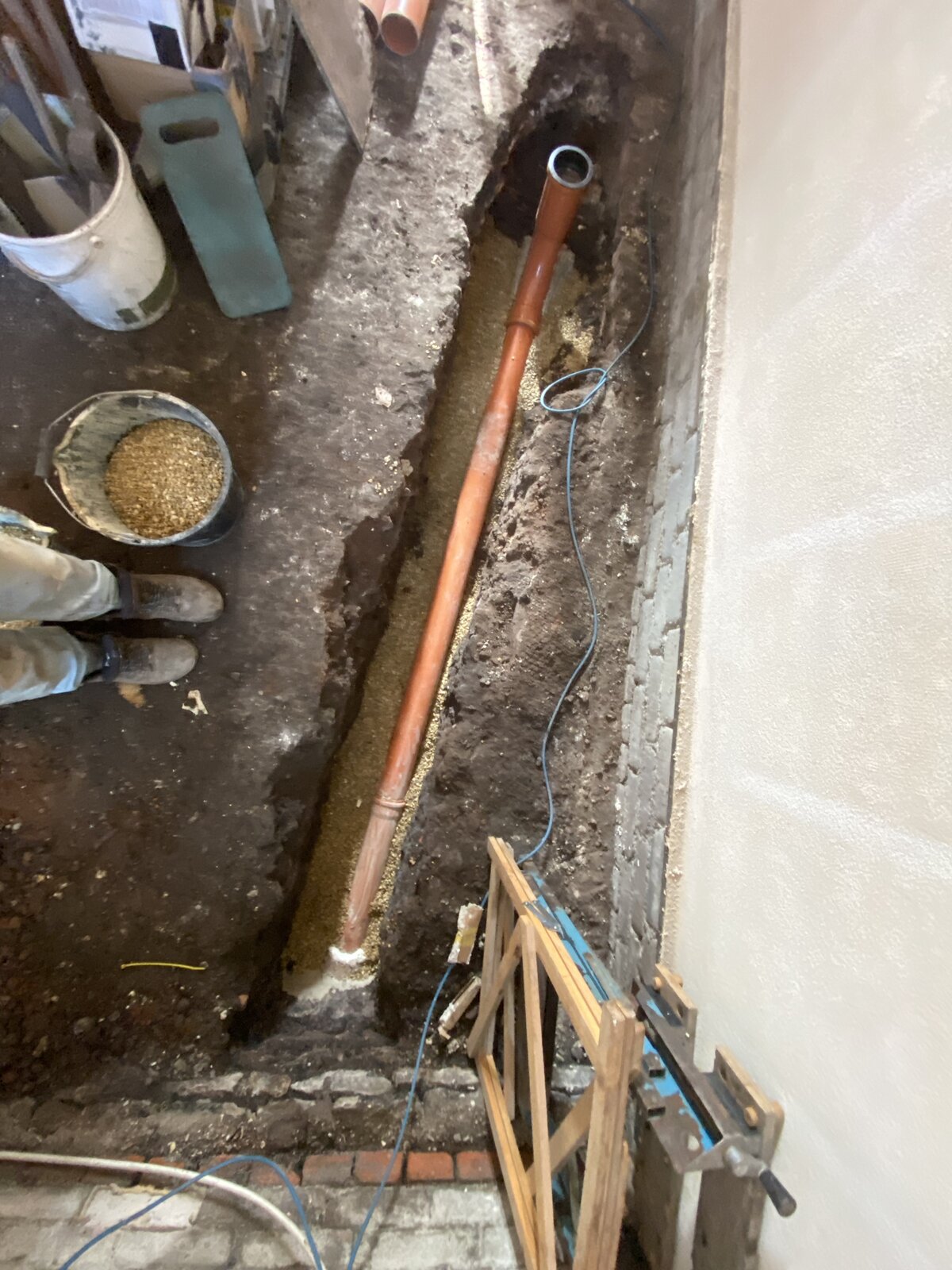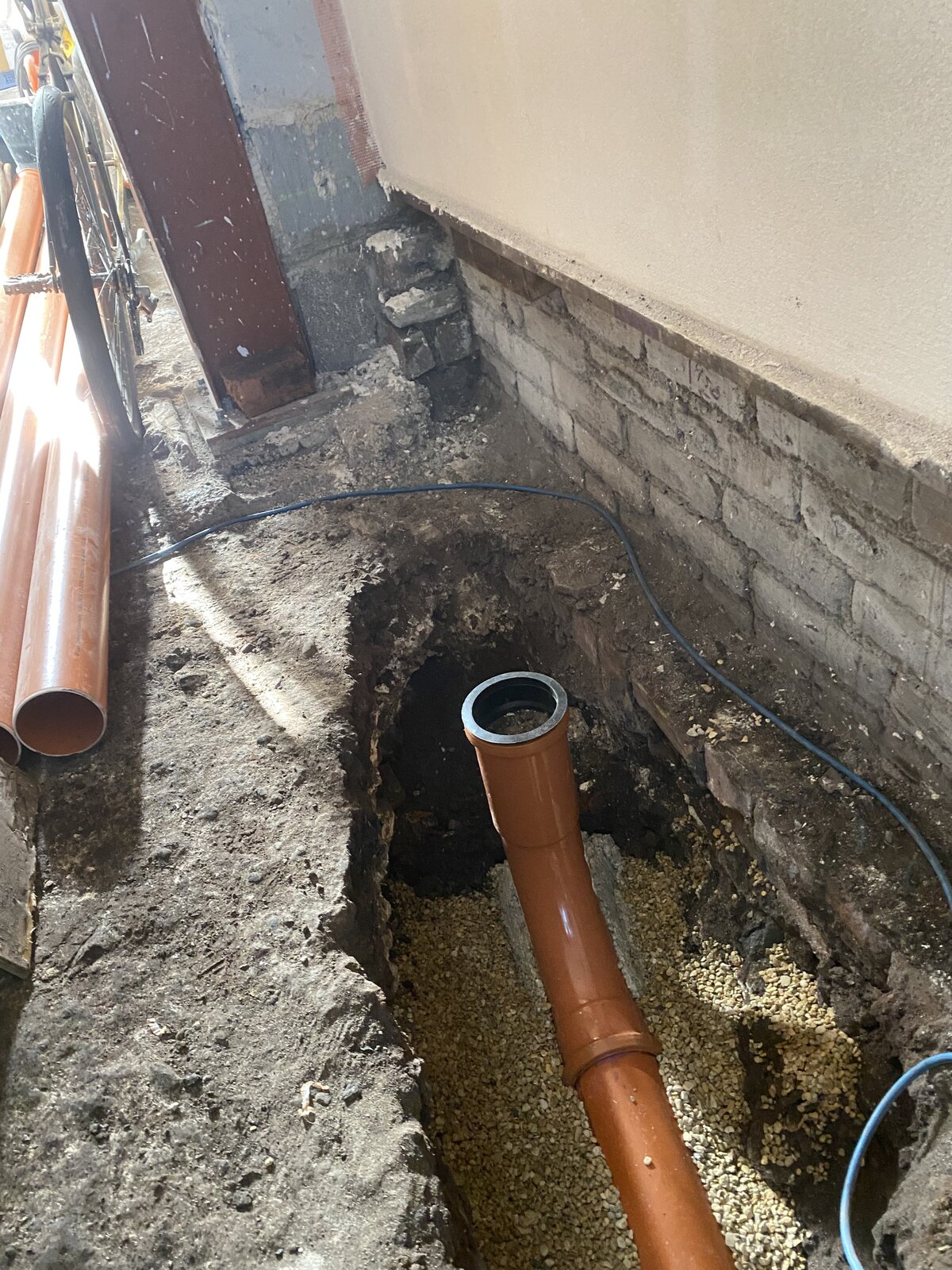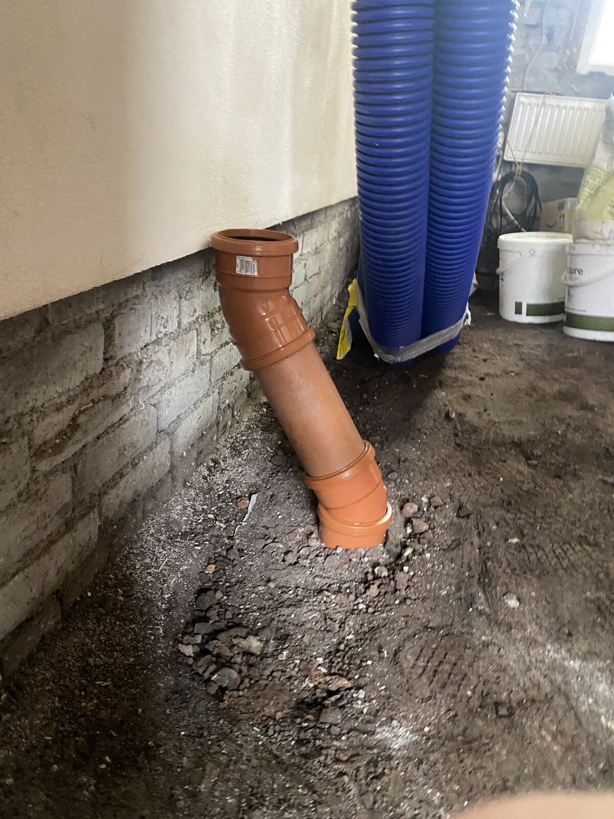 So we’ve a straight run for the new kitchen, from an inspection chamber to a settlement rest bend (it gave us extra depth, to accomodate going under the foundation & to the depth of the inspection chamber invert)