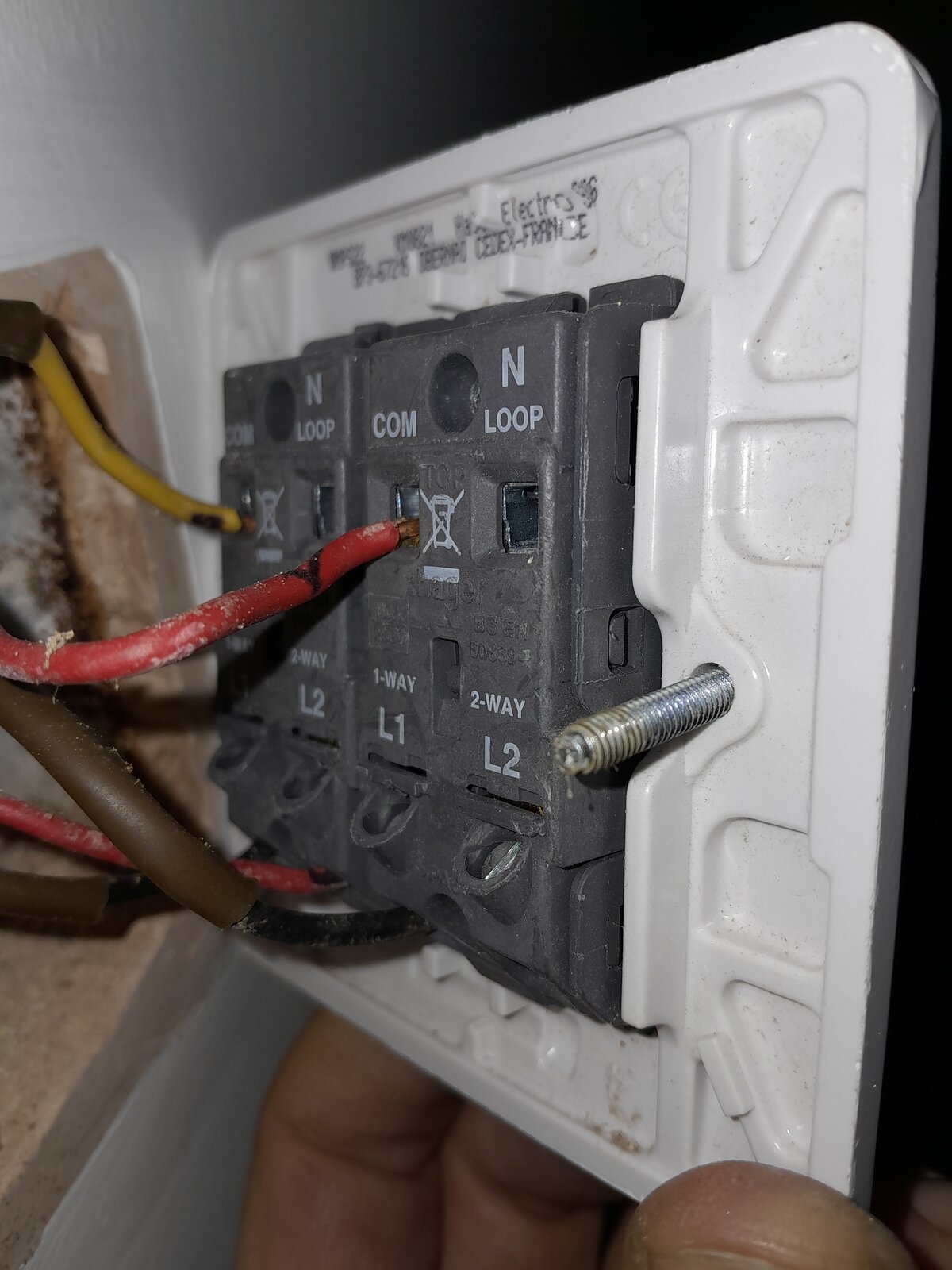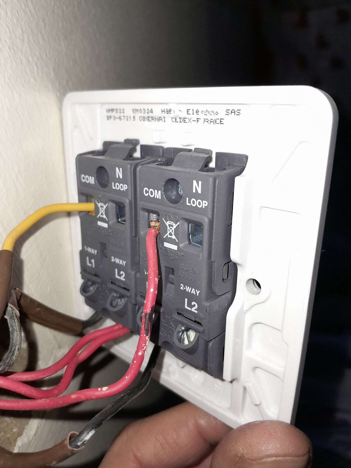 The wire colours look unusual, is there anything else behind either or both switches (like a blue wire)?