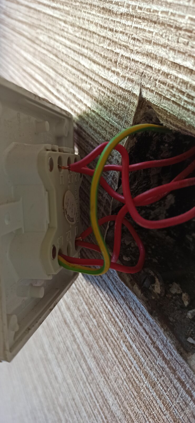 Besides this 2-gang switch is another switch connected to the light outside, but after disconnecting the cables in the 2-gang switch, it's not working. Also, at about the same time ceiling lamp in the living room stopped working. In the living room, there are 2 red cables, so live and switch-live, as I understand, are connected and green-yellow to the box, so GE over there is earth. The multimeter shows only maybe some phantom voltage of about 25V - 30V in the living room.