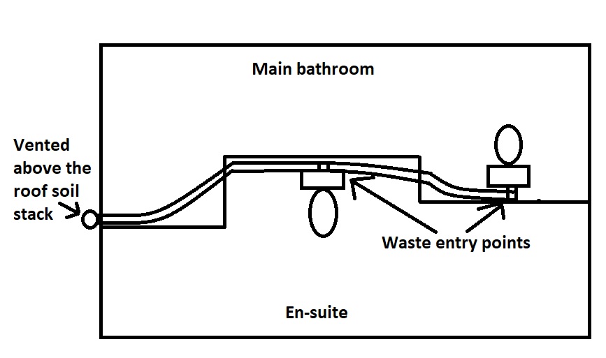 Soil pipe would start in the main bathroom and go through the en-suite where second toilet would entry and then it would connect to outside soil stack that is vented above the roof. Distance from further toilet to the soil stack is about 2.5m.