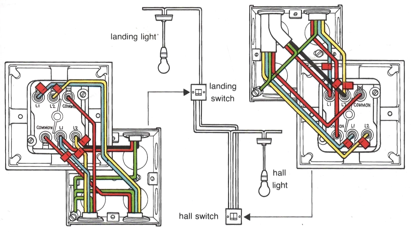 As per the title I'm looking for a circuit diagram of wiring 2 lights one in each room to be controlled from either switch (one in each room) independently. I have found the below image bar the colour change which would seem the correct way of doing this. Or is there a better way to achieve this in a lounge / diner scenario. This would be a blank canvas looping in where required.
