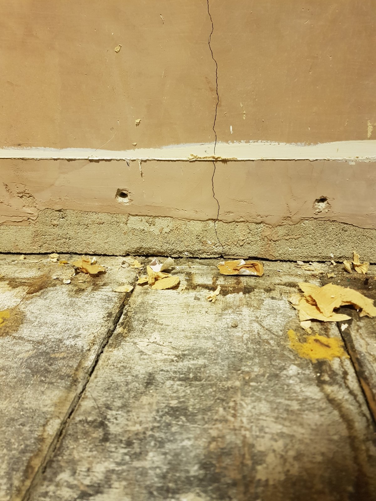 So the wall upstairs, the floor has dropped fractionally, meaning the blocks in the middle of the wall are not sitting on anything hence the visible movement when removing the skirting, of even giving the wall a hard shove