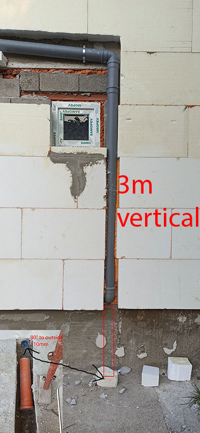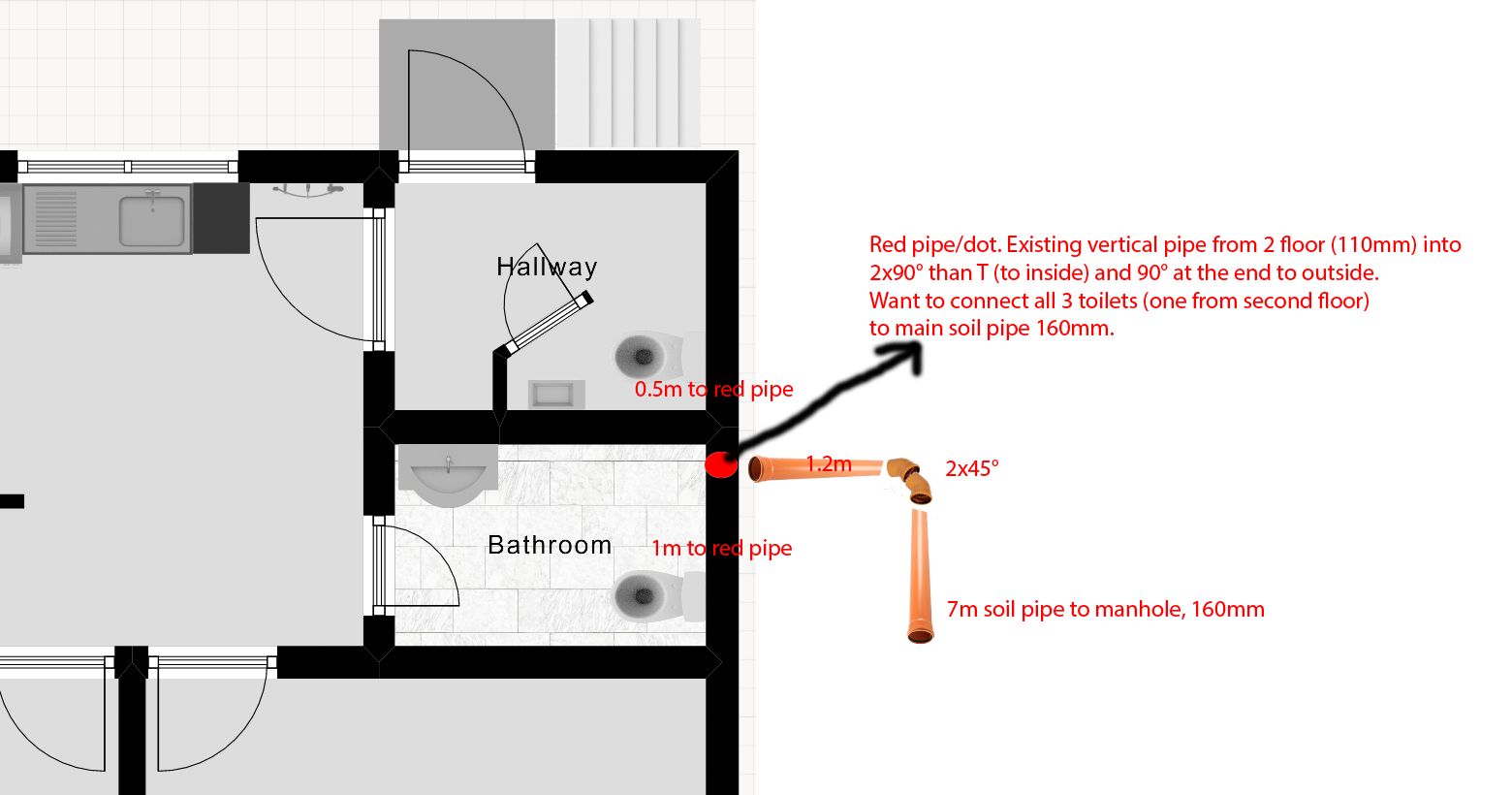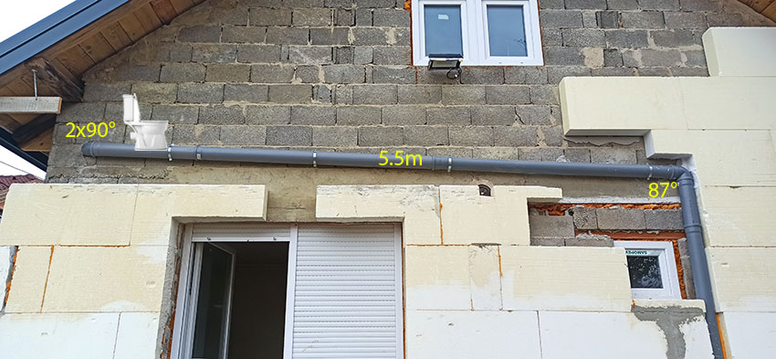 One toilet is on second floor and must have 180 bend to vertical pipe. Now we have 1m 110mm pipe from toilet into 90° left, than 1m straight than 90° left to 5.5m pipe on outside wall. Again 87° vertical down 3.5m. In this vertical pipe, 0.5m from ground is T 90° for connecting two toilets. At the end of vertical pipe is 90° toward mine soil pipe 160mm.