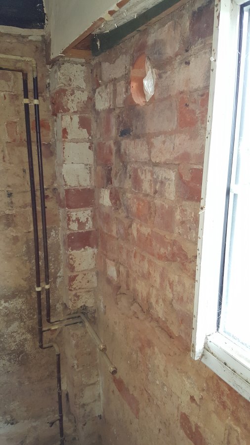 Here's the problem, once we have removed the wall paper and boarding from that wall to expose the brickwork they have removed the inner row of 4.5" bricks to the lower old part of the house. Then built a new single 4.5" brick wall for the extention on top of it. This is from ground floor to the roof.