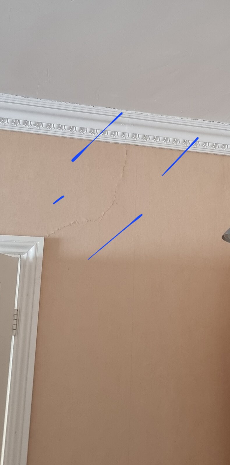2. Cracks above door way. Ref 2 x images. Again, speaking to friend, suggestion is maybe thermal, given wall likely block. Seller suggested these will filled as part of redecor but appear to have reappeared. Unknown when / if same.
