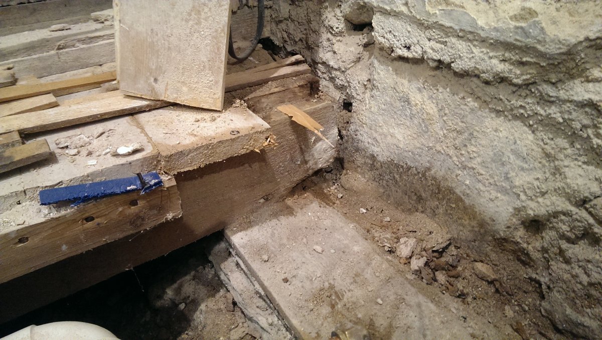 OK, so I'm completely renovating our downstairs bathroom. The house is an old Scottish traditional building of granite with lath and plaster walls. One of the effects of lath and plaster was for the plaster to slip down behind the laths during application and onto the underfloor joists encasing them in a nice porous bed of plaster bridging onto the external granite wall which unsurprisingly attracted some rot in the joist ends.