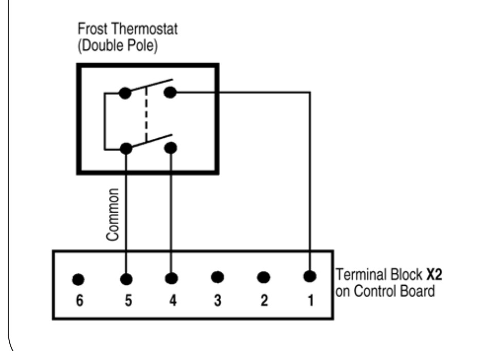 Reading the wiring schematics from the installation manual, I need to use a double pole frost thermostat, however the pins on the PCB are labelled as Fs, Fr and Fr. e.g. Frost Supply, Frost Return, Frost Return. Also, my understanding is that double pole thermostats need four wires, but only three are in the schematic.