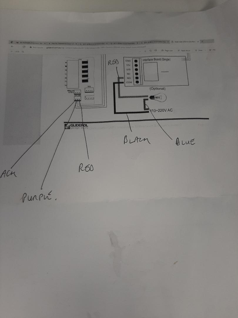 I came across this diagram from Gliderol which shows the option interface board that can be purchased to add an external light, please ignore the hand written notes.