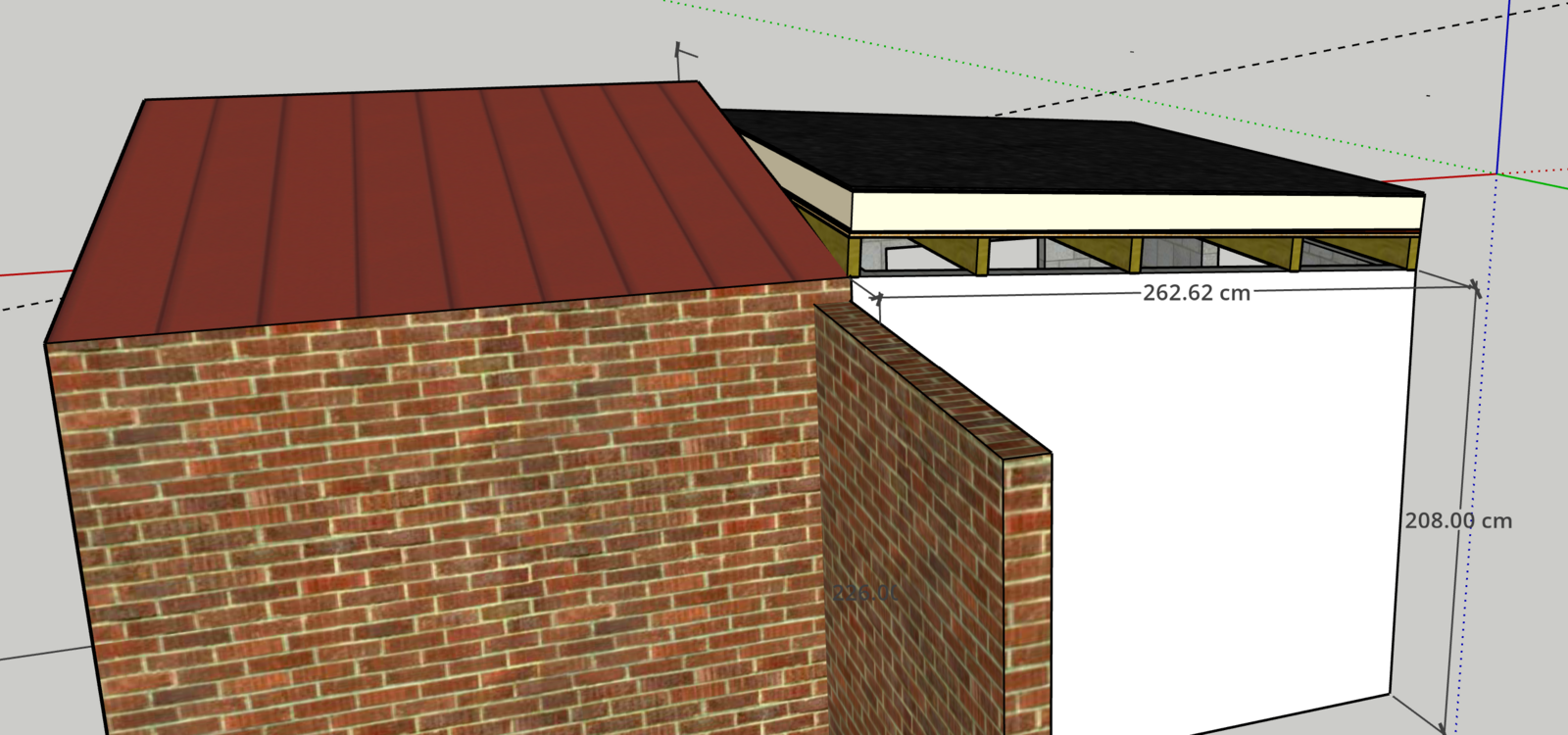 I am looking to turn an old single block (small) building into an office. The current roof is corrugated cement (containing chrysotile asbestos) and the back wall is also the garage wall of my neighbour (rear joist rests on the walls and is not fixed to the garage). I want to remove the current roof and add a 'flat' warm-roof; however, this will be next to my neighbour's (sloping corrugated bitumen) garage roof. I'm unsure if this is 'do-able' in order to maintain 'warm' and dry. We've just moved into the property so want to stay on our neighbour's 'good side'! I've attached a couple of pics of the current set up and a 'Sketchup' of my proposed idea. Any thoughts or advice (constructive!) are appreciated