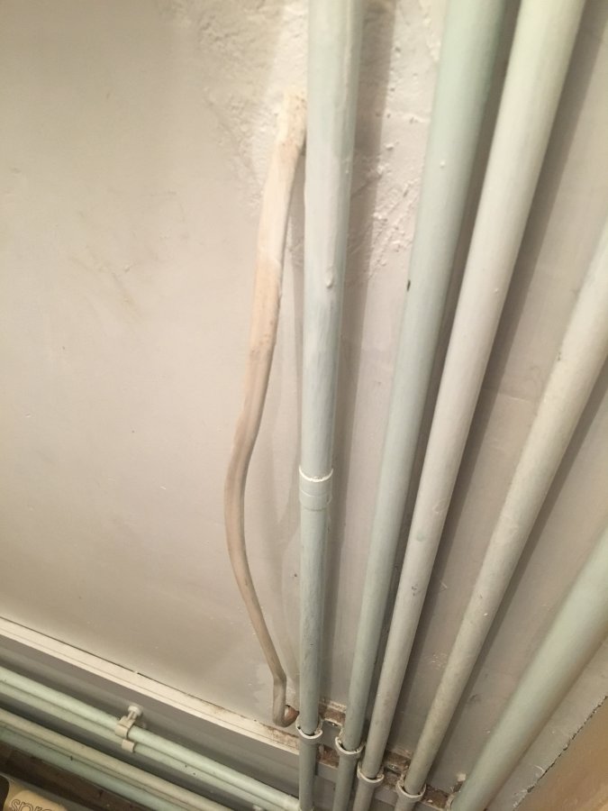 2. Cabling I spotted yesterday. I guess there must have been a plug socket where the wire appears at the bottom of the picture, that has been rerouted up and through the wall into the kitchen, becoming a double plug that powers the microwave. I'm going to put some conduit over that at least to the interim, stop the toddler pulling it out and shocking Mummy while she loads the washing machine.