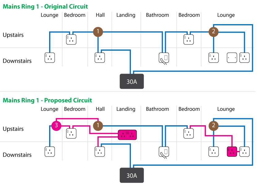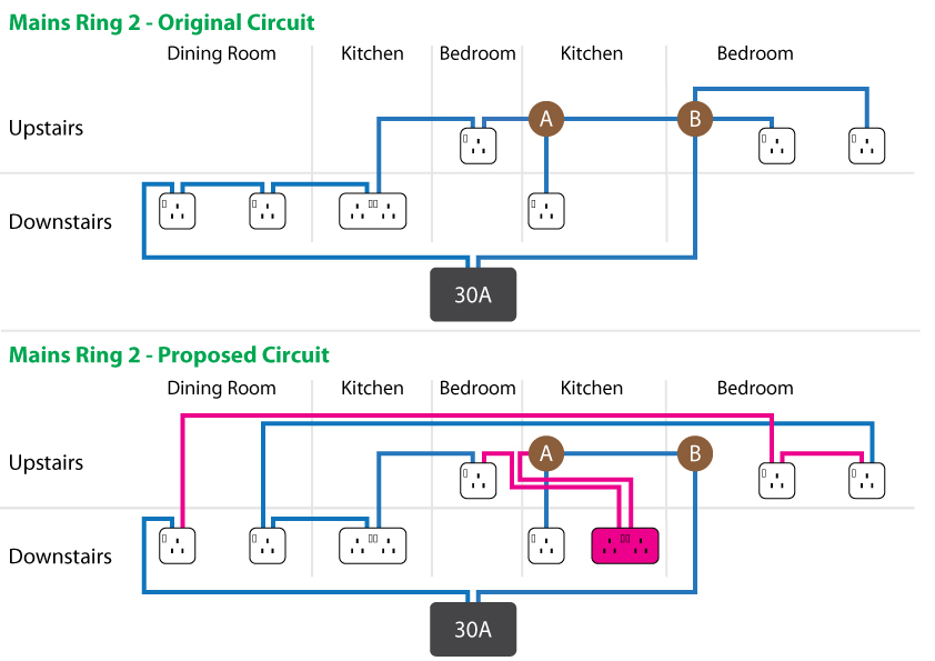 I’m a DIYer planning to add some sockets and resolve some double spur issues I have found on my parent’s mains rings. There are two 30A rings, one serving the front of the house and the other, the rear. As there are crawl spaces on either side of the house, I have been able to trace the circuits easily, although the diagrams I have made do not accurately represent the distance between the sockets. Luckily there is conduit feeding every socket and I can carry out my work from the crawl spaces without damaging walls or lifting any floors.
