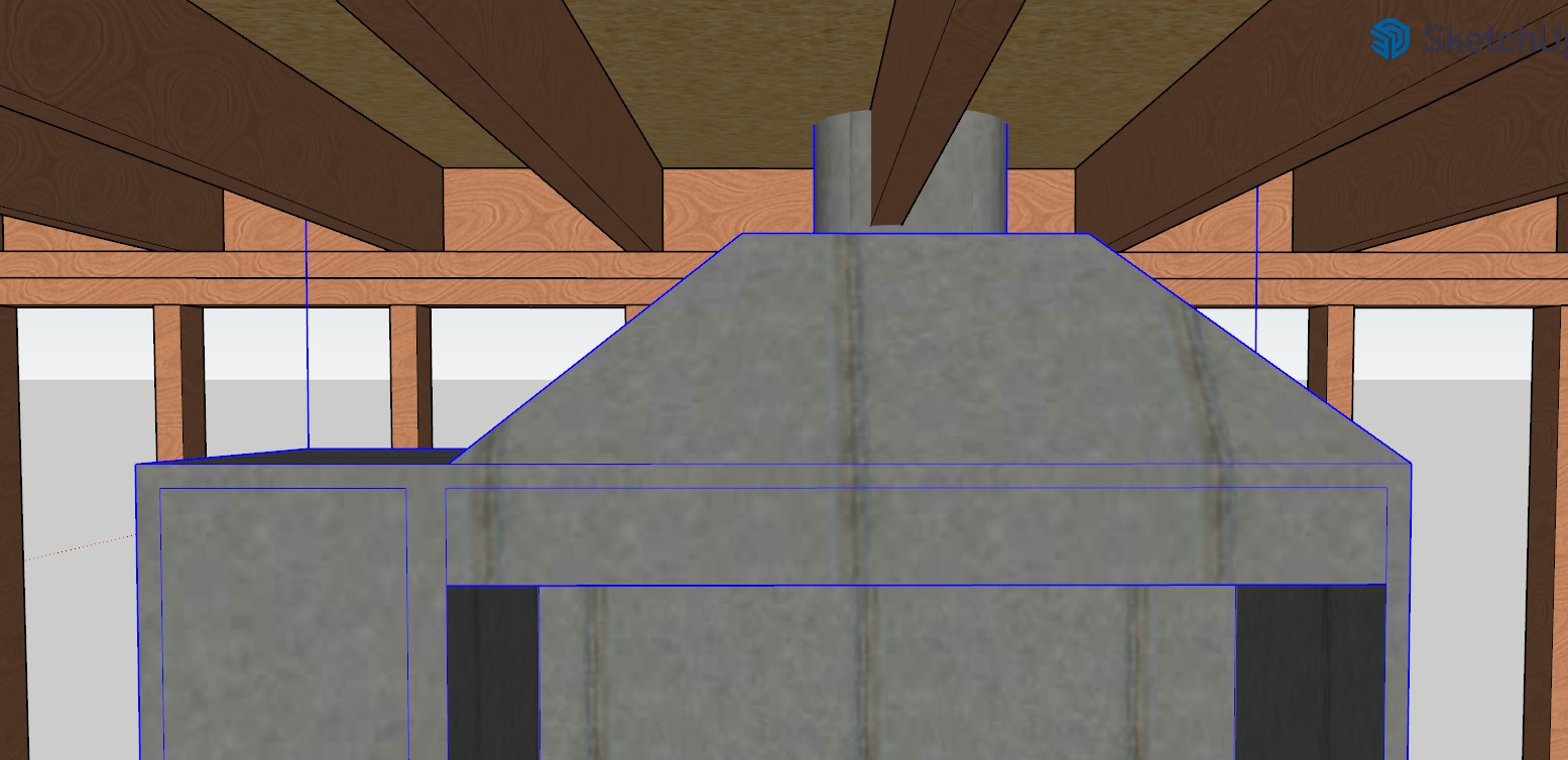 A rough sketchup of the approximate distance from top of the Braai (gather) to roof space shows its too close to combustibles (i will obviously have to rearrange the roof joists to fit around the chimney)