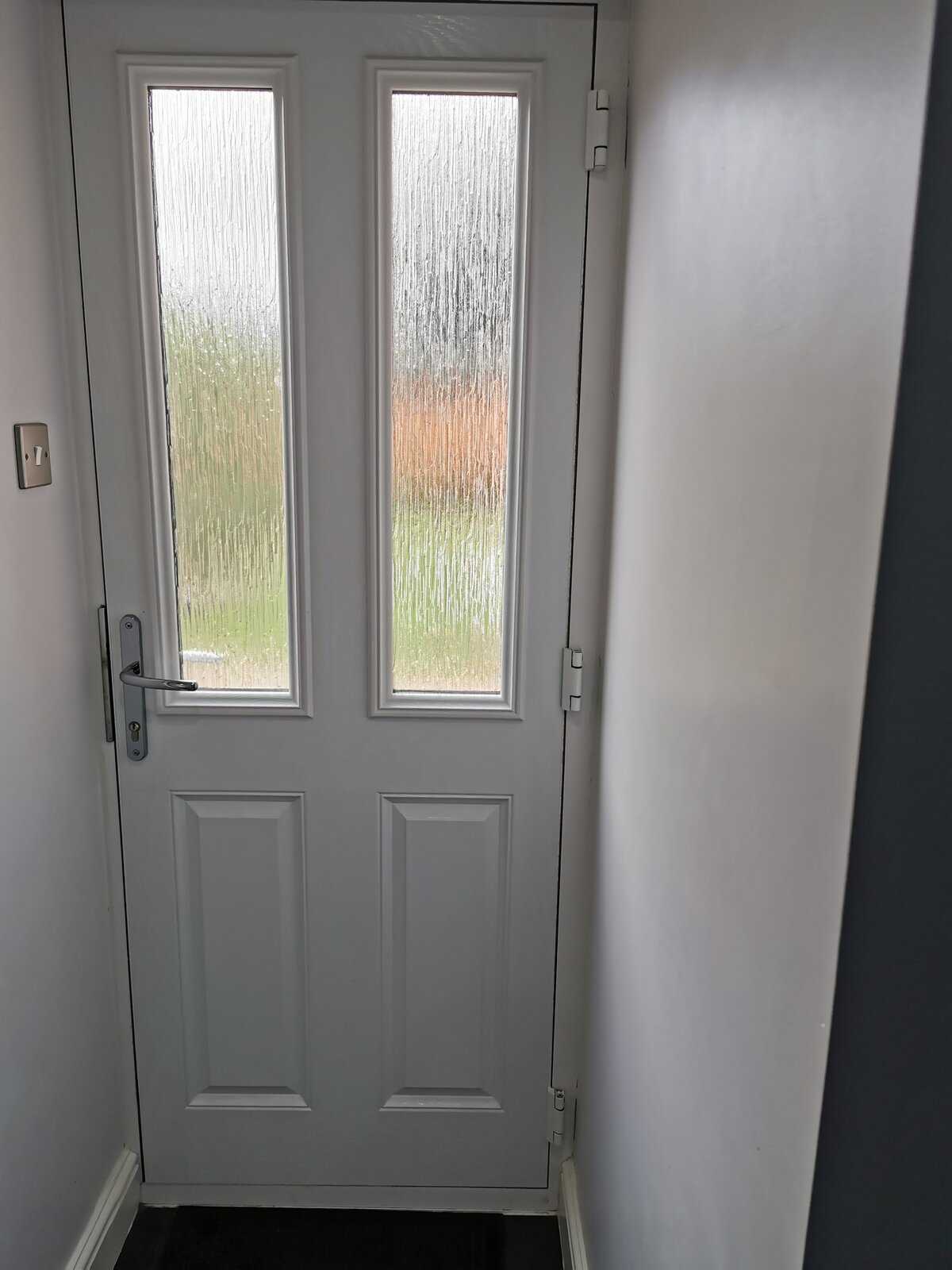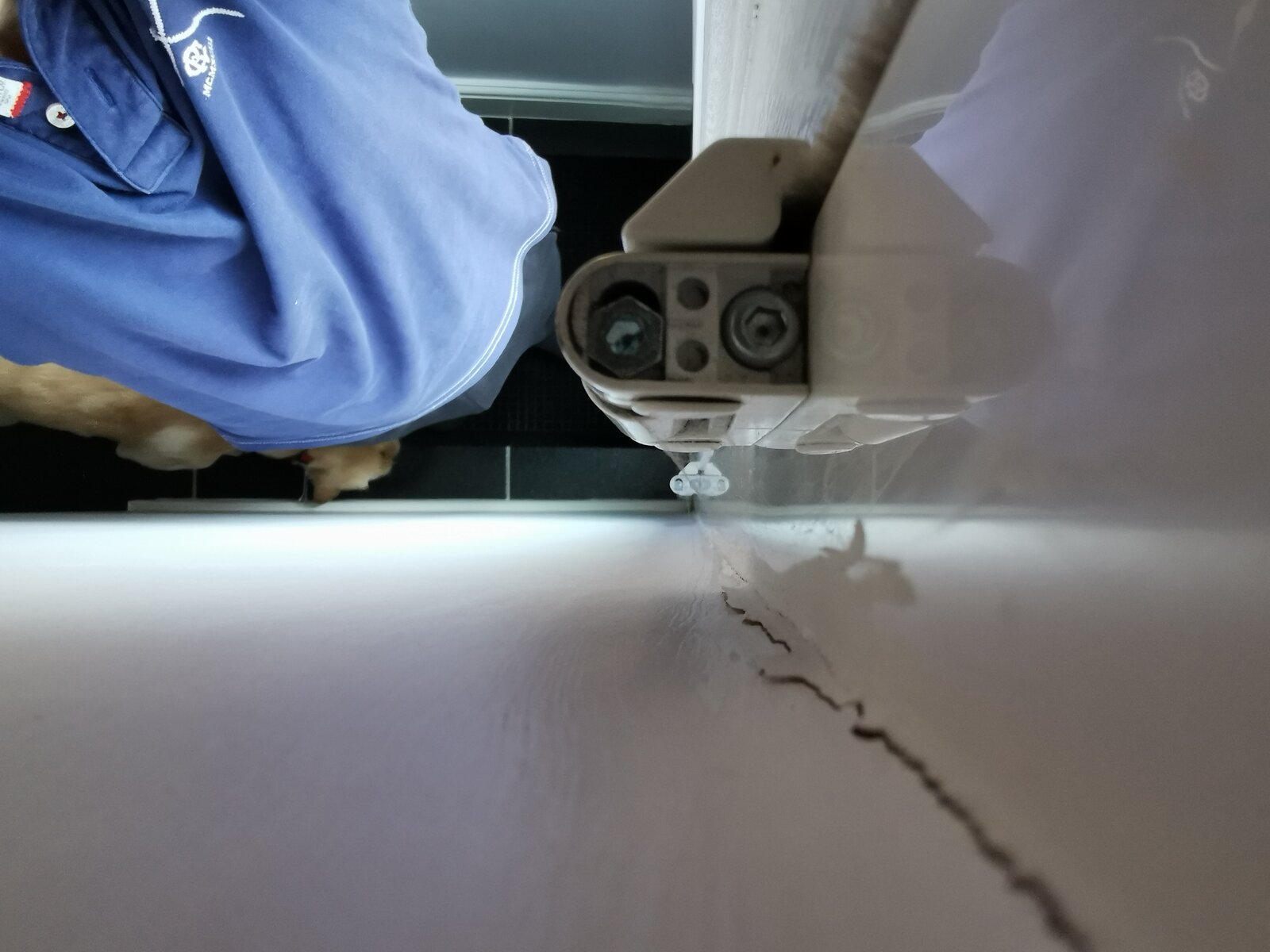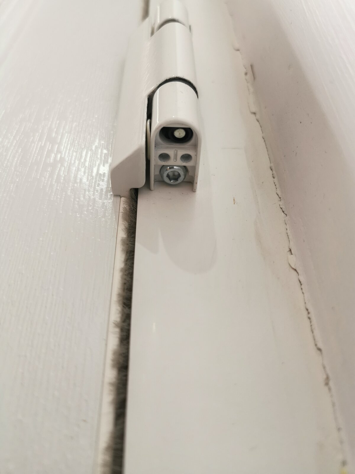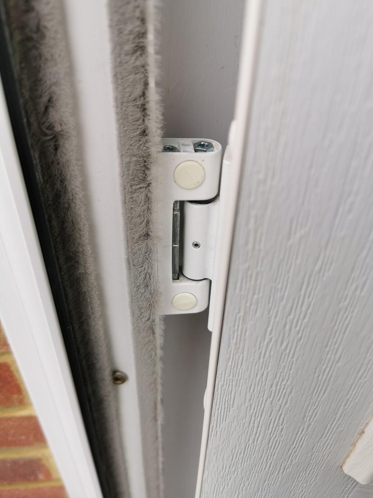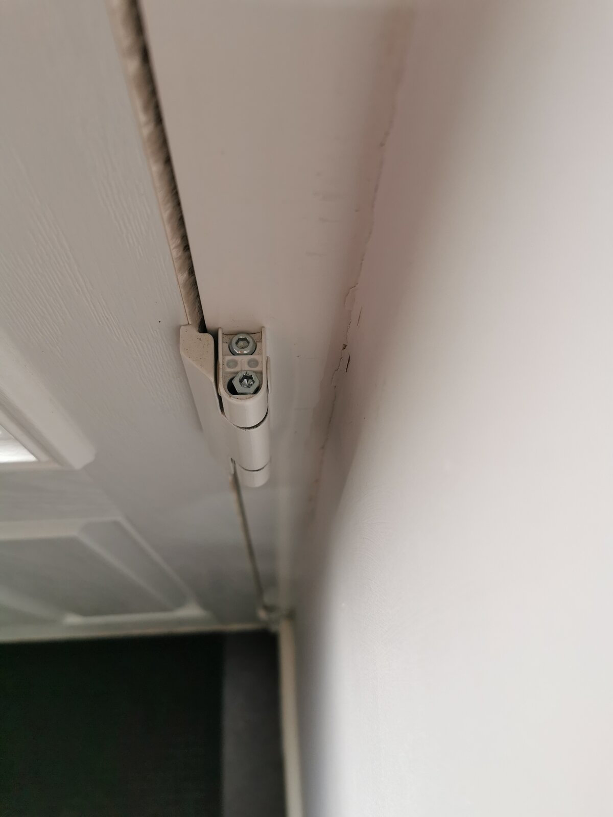 Hi I've got this composite door and it's slightly catch at the bottom. Looking down the side it is narrow at the bottom and wider and the top. Ive no idea how the hinge is adjusted. I've attached photos could someone explain please??