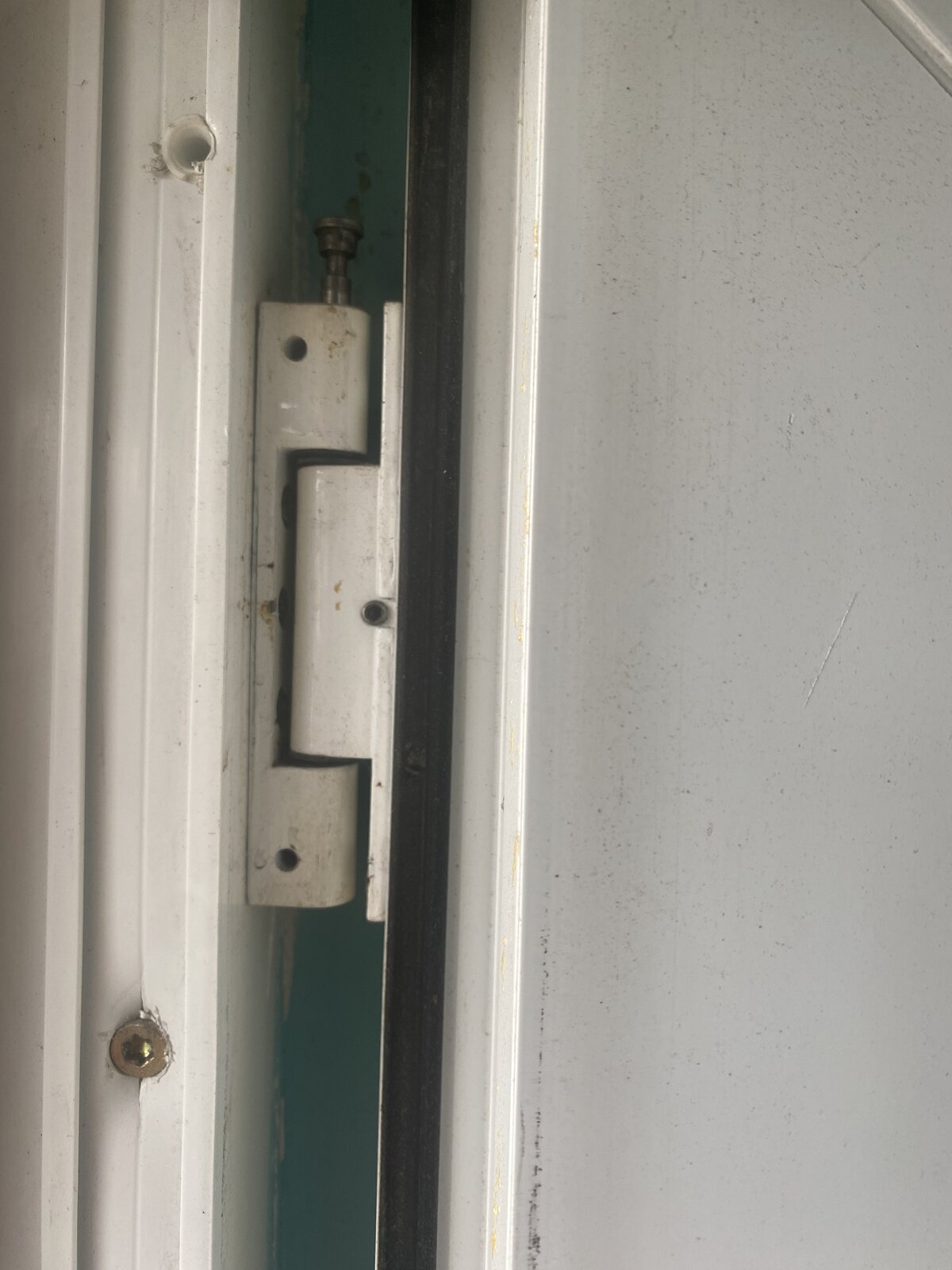 Look underneath, could be an allen bolt, tighten it and it should push a plug up and lift the door, old hinges though and there won't be much adjustment, possibly may need to toe and heel the door instead