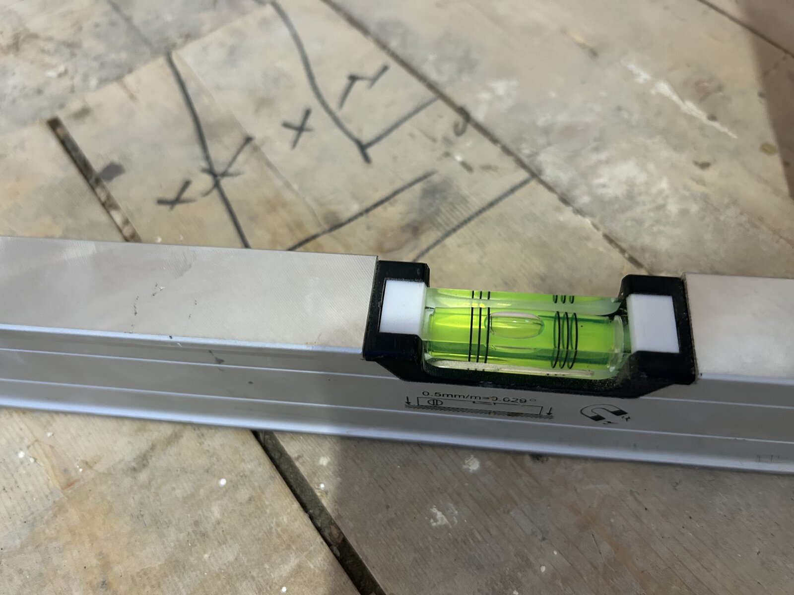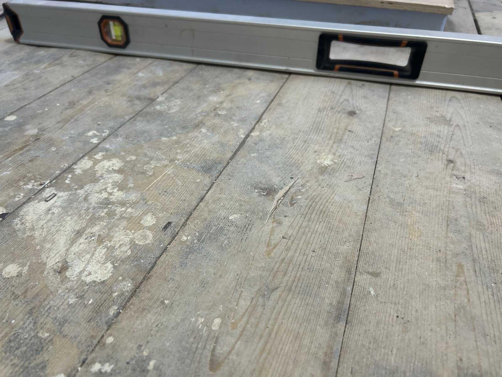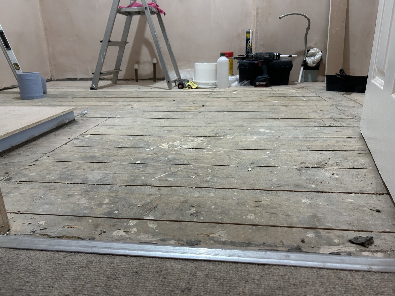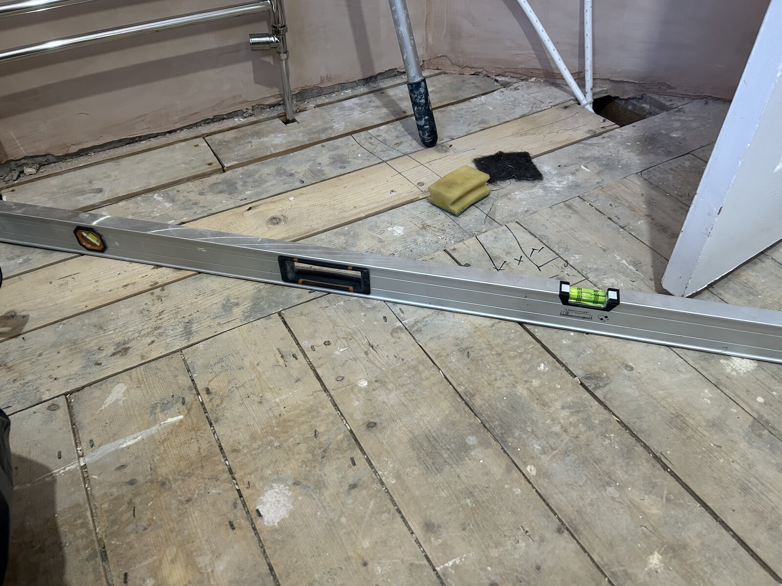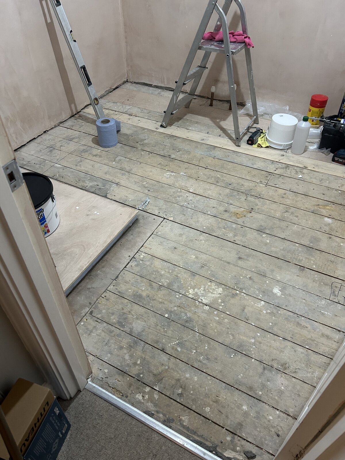 Hi everyone. After a bit of advice / suggestions before I embark on tiling my bathroom floor. It’s on 1st floor with floorboard subfloor (see pics). It’s relatively flat but runs out of level by about 10mm at the door (presumably because there’s a thermalite wall held by joists that side. My initial plan was to Hardie board with flexible adhesive underneath then tile 200x200mm on top. I can’t really afford therefore to build up at the door by 10mm as the threshold would be really high. Any advice? Do I just go with a flat but out of level floor, or is there another way? Will I run into problems tiling?