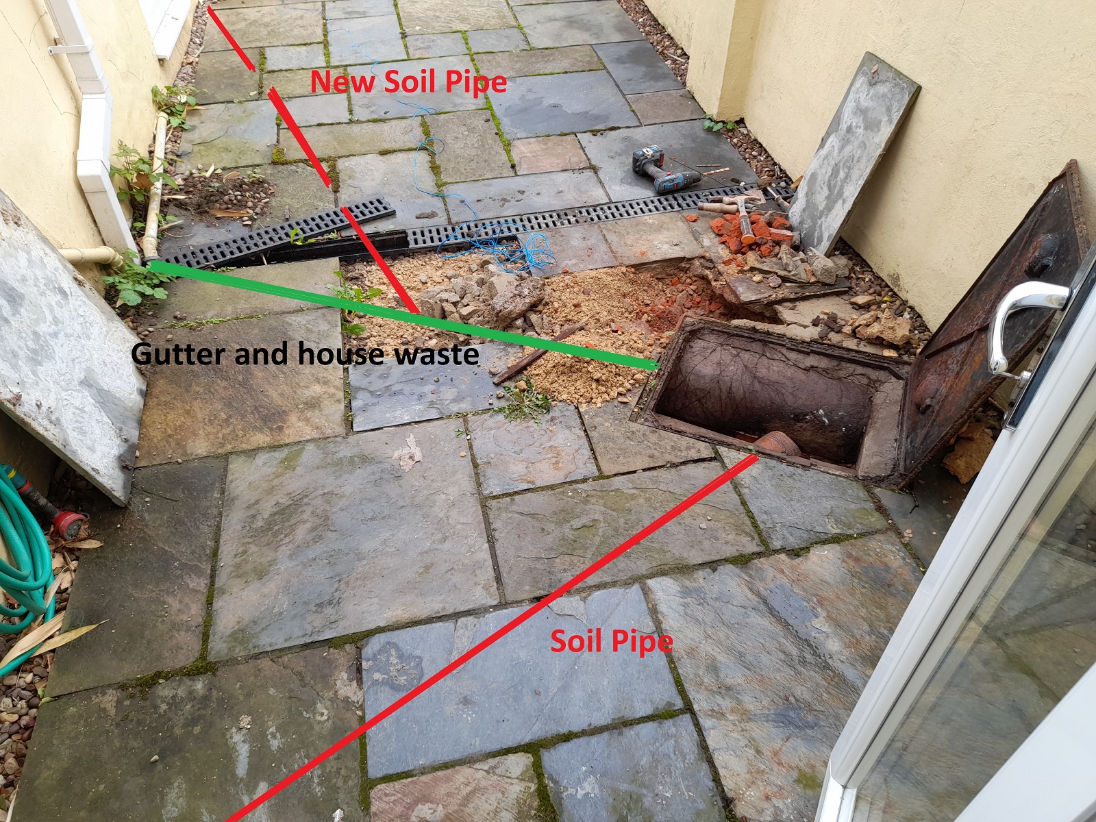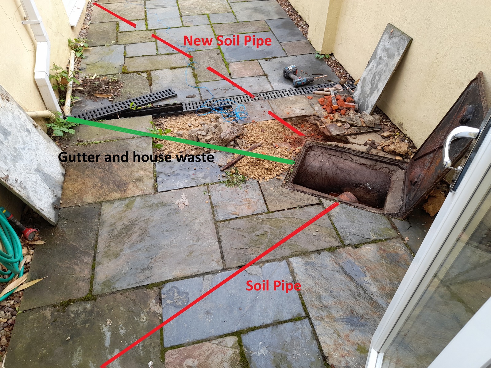 I am looking to add a downstairs toilet to my house, the current bathroom is upstairs. Ive taken pictures of the current arrangement which has an existing soil pipe joining to the inspection chamber, along with a second pipe that also joins to the chamber which carries gutter surface water and kitchen water.