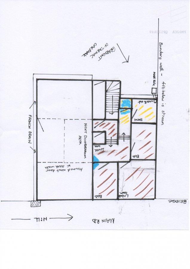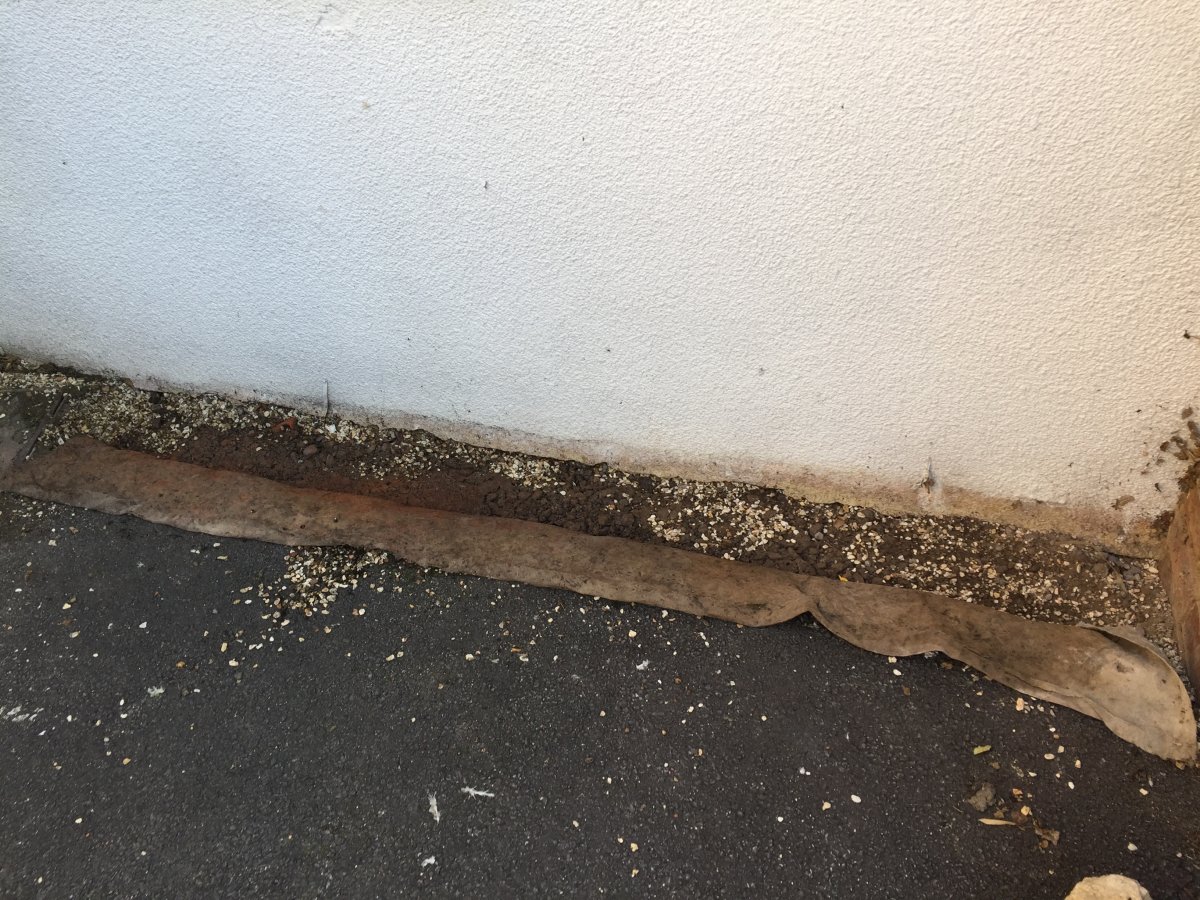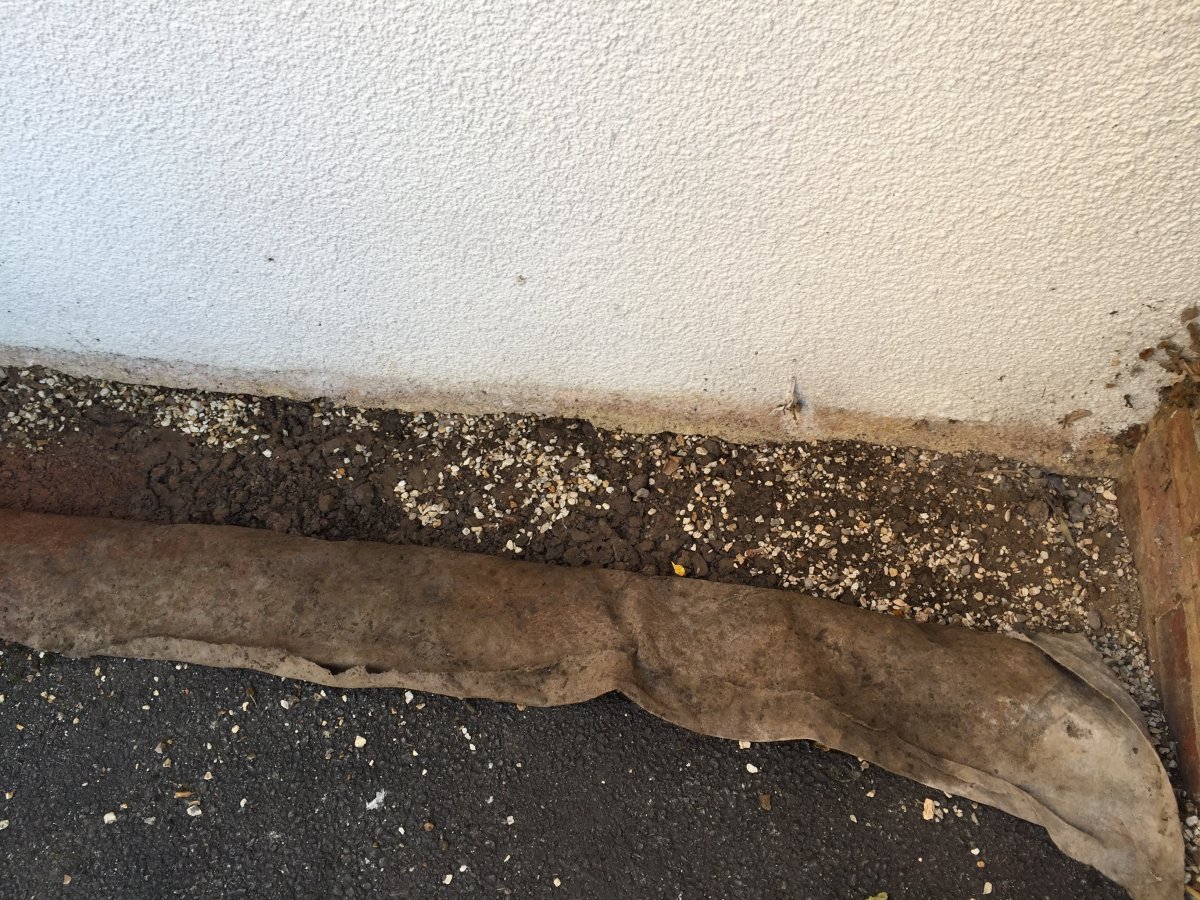 I went to the flat today and removed the gravel on the so called "soakaway" , revealing only 2" of gravel then hard compacted mud and stones. Not a soakaway at all or a path for running water. with the wall to the left of the image it is like a swimming pool with nowhere to go. No wonder it comes through the bl**dy wall !