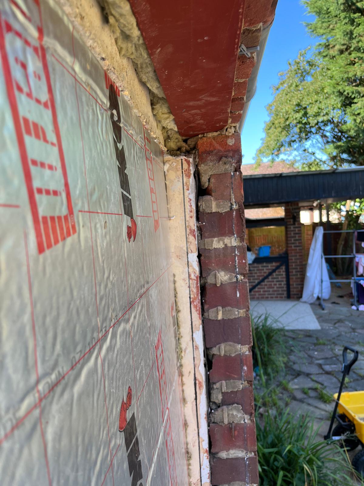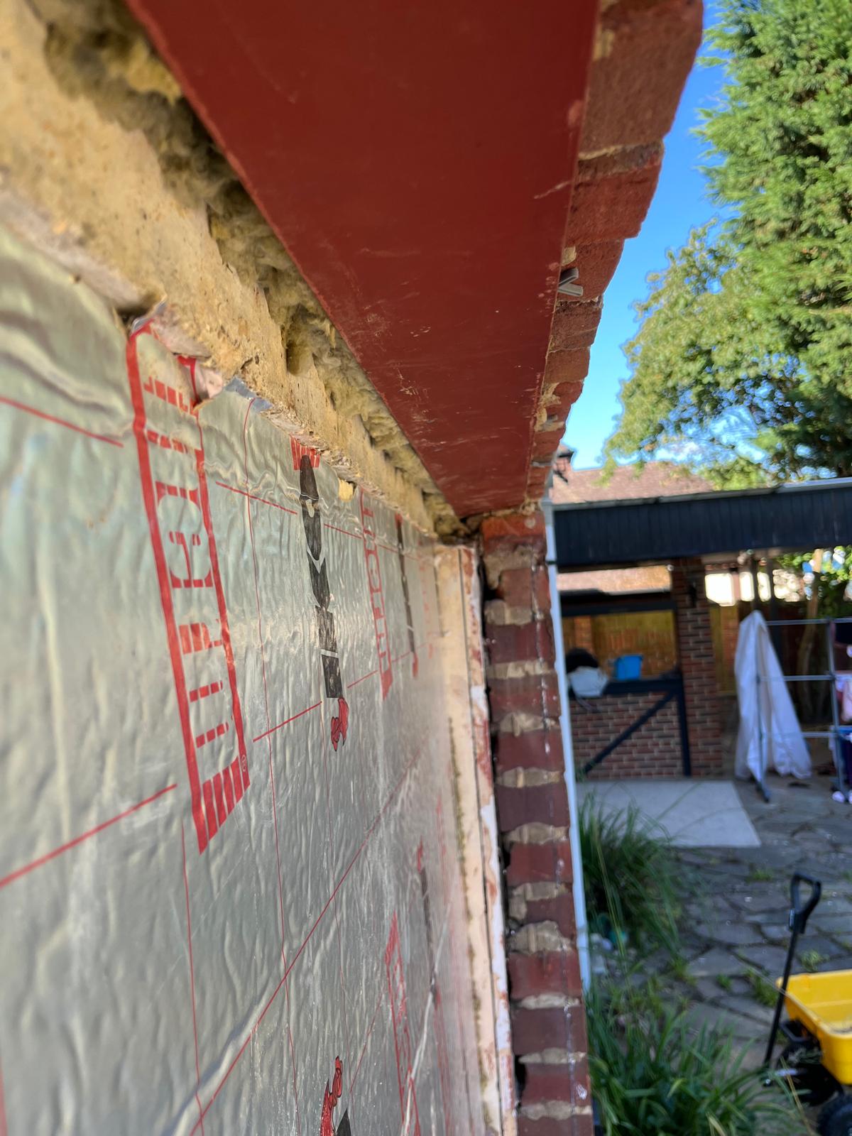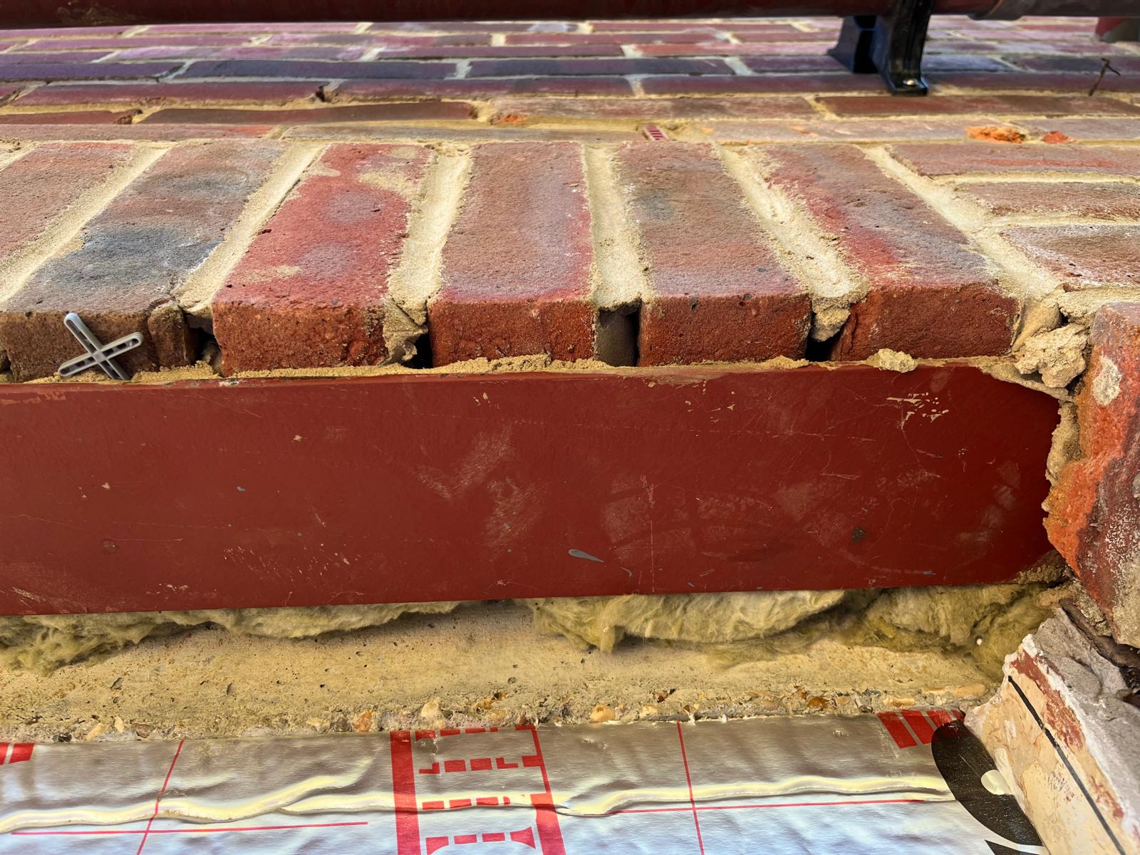 Install a steel beam (next to already existing concrete lintel) to support bowed brickwork above the existing opening between living room and conservatory and meet building regulations. Supply and install inc make good to brickwork only.