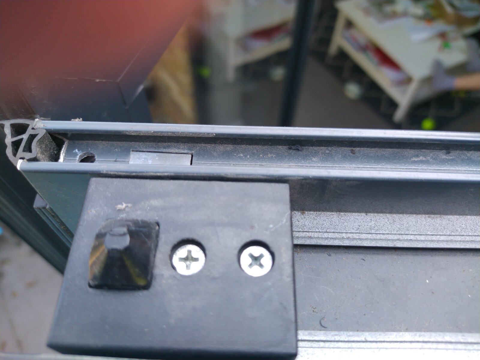 At the top of the door where the bolt comes there is a plastic guide which keeps the bolt in place and this is held to the door by two screws which screw into the plastic inner of the frame. For some reason both of these screws worked loose and snagged on the rubber seal of the door which was how I noticed it. I tried simply screwing them back in but the holes seem to have become worn so the screws now will not tighten.