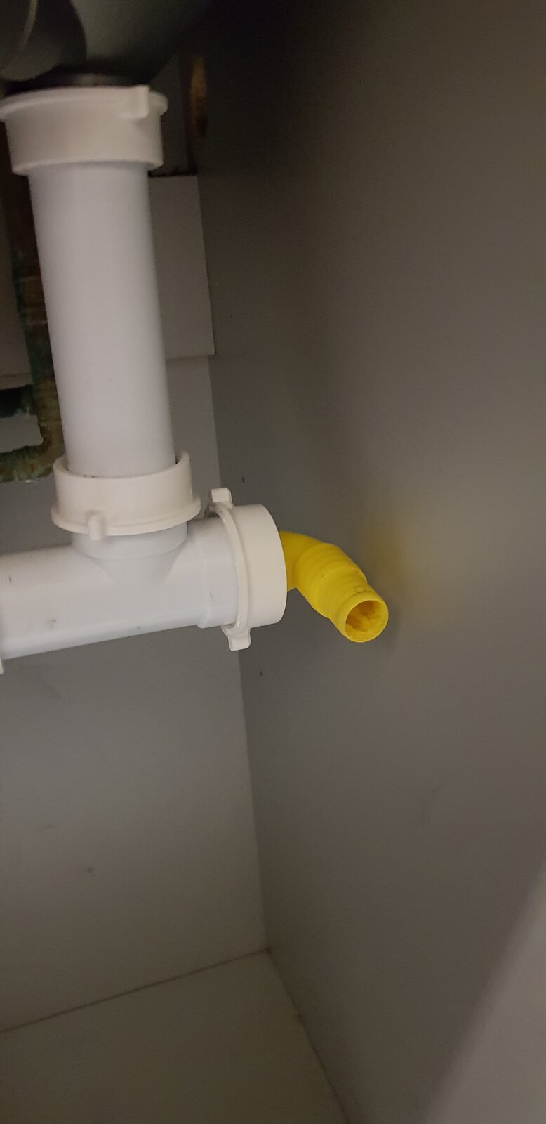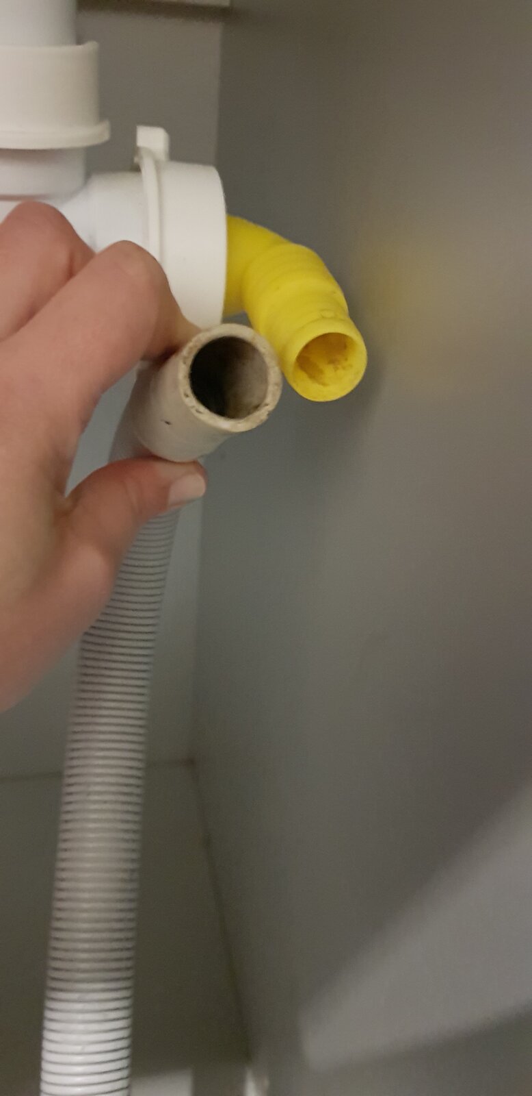 I'm trying to plumb our washing machine in at our new house. I've attached some pictures, and I assumed that the machine pipe needs to go over the yellow pipe, which is fitted under our sink. However the waste pipe from the machine doesn't seem to fit over the yellow pipe. Am I missing a connector, or do I need to replace the existing fitting or pipe? Any advice would be appreciated, thanks!