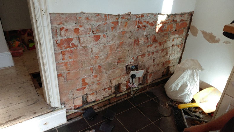 We removed the skirting ourselves and in the end the guys said the chemical damp proofing wasn't needed as they'd sorted it the traditional way by wrapping the joist ends in this black plastic and the pan wood, which would stop any water rising. The bricks below were dry and in reasonable condition for a 110yr terrace.