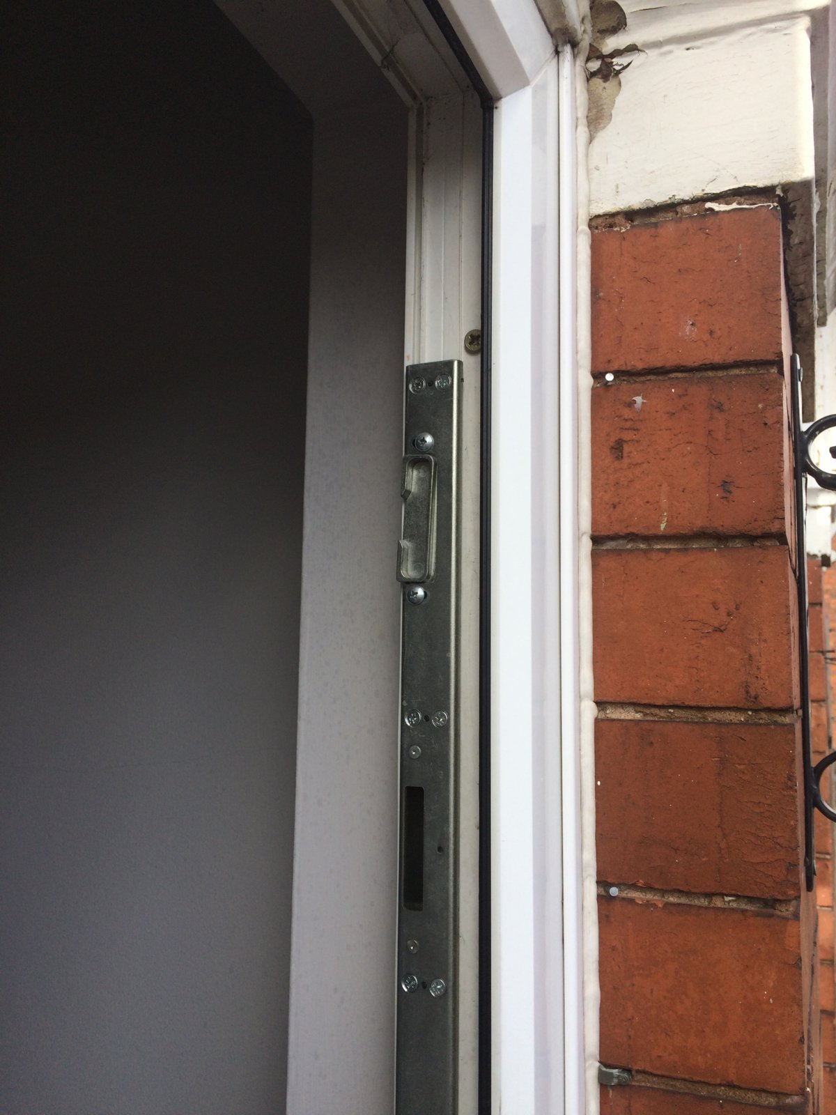 So a short time ago I had a builder come and install this door. We had an old wooden door with an arched window above which was lovely to look at but rotting. The builder came and installed his!! (see pictures).. The window arch was removed, replaced with a sheet of PVC and sealed. The mess you see to the left is where our mains cable entered into the house. This has since been moved so the whole thing looks even more unsightly now.