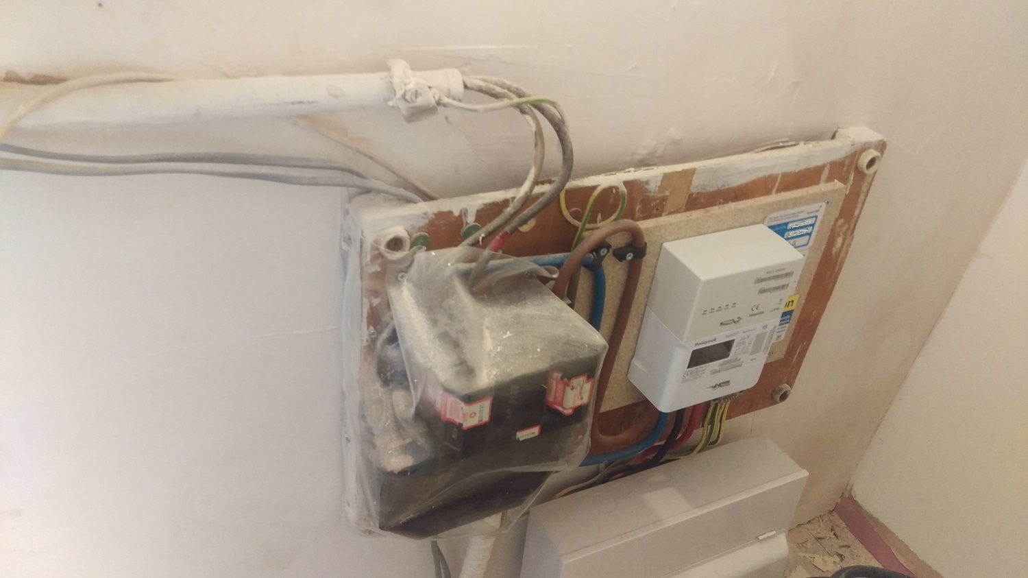 Hi. I live in an upstairs flat, and it appears that my electricity supply comes first into the downstairs flat. From there, two cables run from where their meter is, via a metal tube, into the wall and up into my flat, where it enters the black box next to the meter (is that the cut out box?). See attached pic, where the cables run in the white pipe to the left of the box.