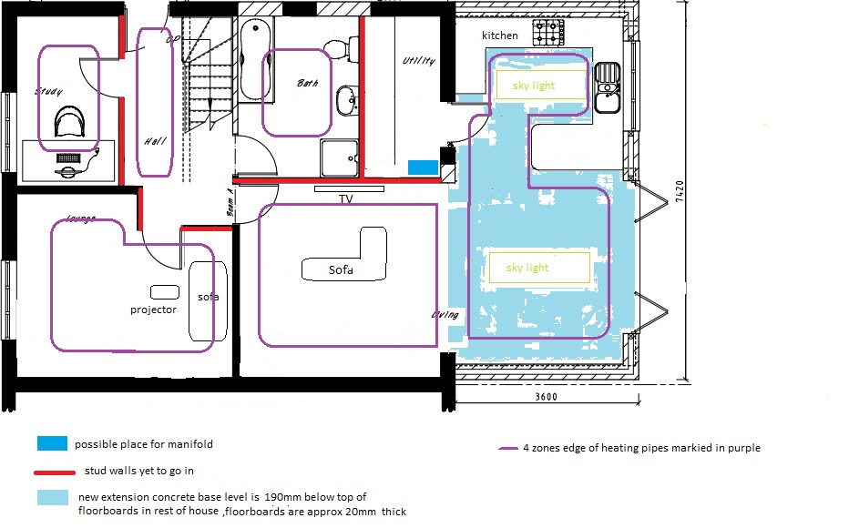 As far as zones the bathroom i'm thinking would be one zone, the hall a zone, the lounge another and finally the living/ kitchen room I'm thinking would be two zones due to a height difference of the pipe beteen the old and new parts of the house (top screed above pipe needing to be thicker than floorboard thickness)- so 5 zones. I'm not overly fussed about the study this could have UFH or just a radiator.