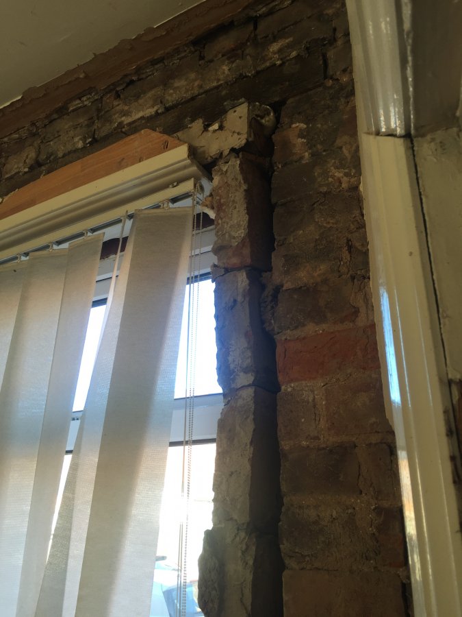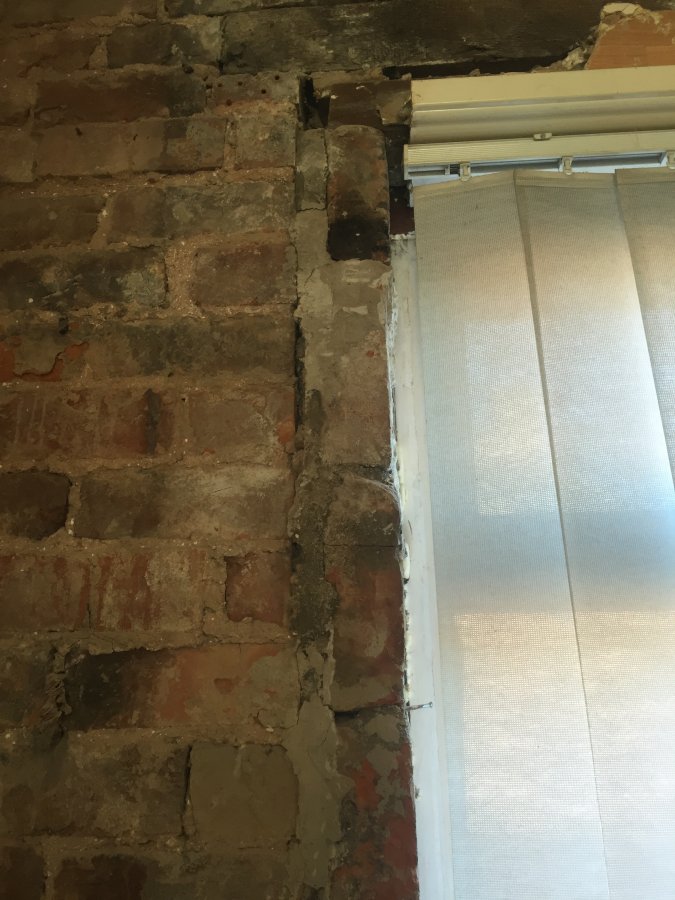 The exposed brickwork now shows an unusual arrangement around the window. To my untrained eye, it looks like a previous owner has attempted to reduce the size of the frame by adding a layer of bricks to the sides of the frame and a piece of timber horizontally underneath the lintel.