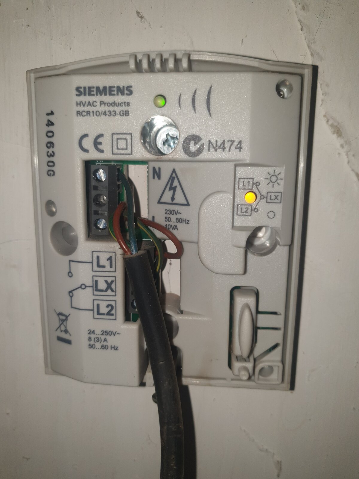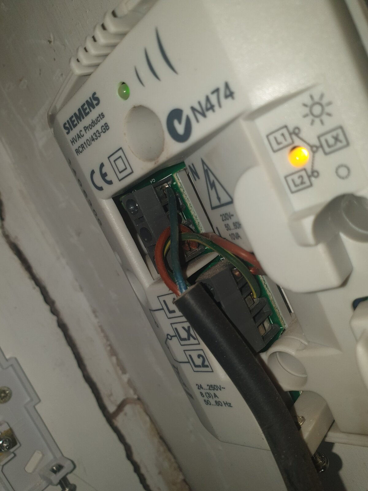 I've attached the picture of the Siemens receiver, which looks as though the blue wire is permanent neutral, brown wire is permanent live, green and yellow wire is connected to LX and there is a link between permanent live and L1