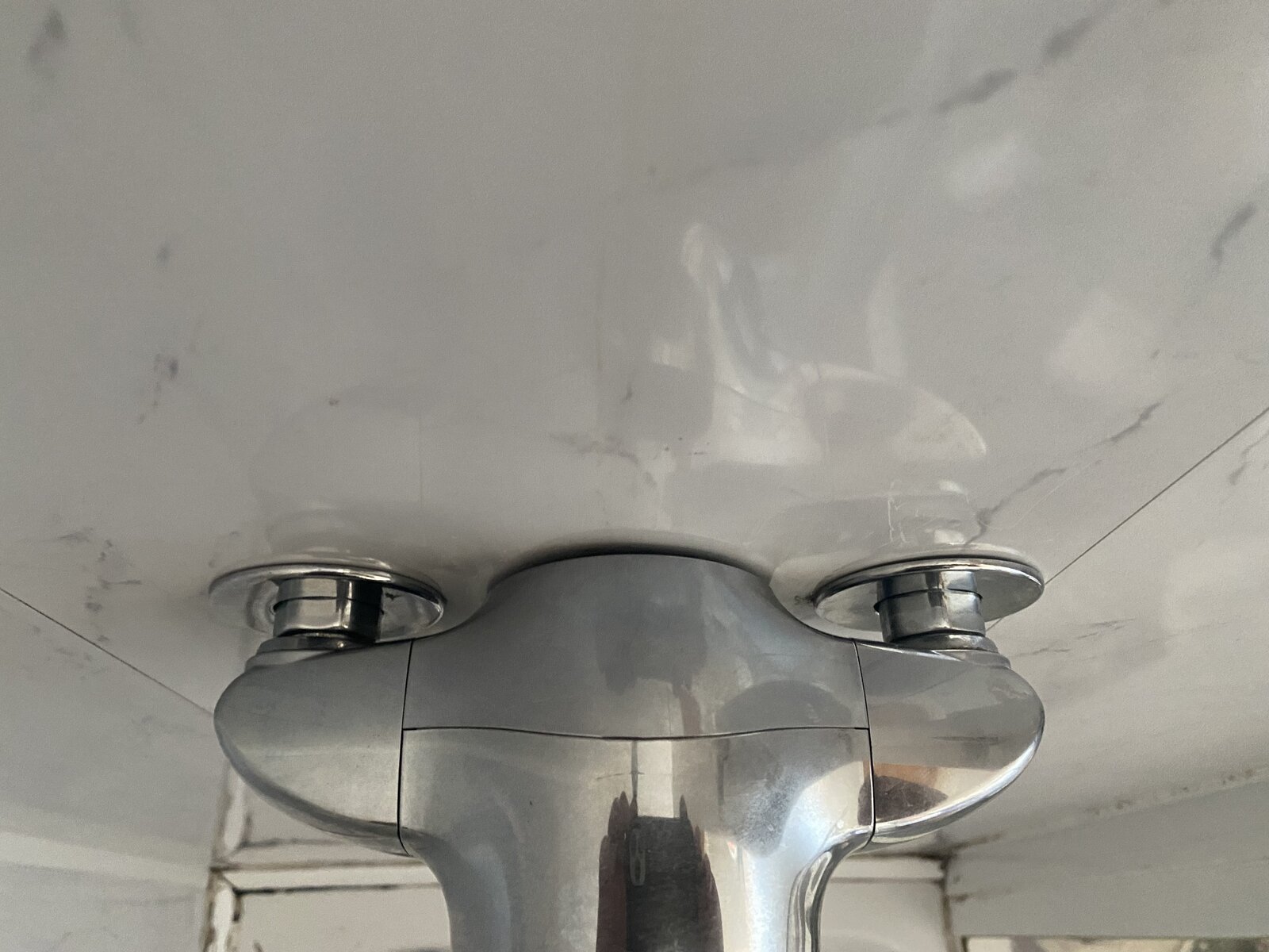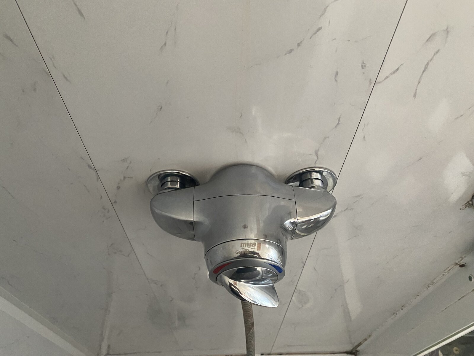 The only problem I see is that the Mira shower (boiler/mains fed) head is fixed and if I step it out another 10mm and over seal/overlap the existing with new panels I can not get it back on due to not enough thread (not sure what’s behind it?).