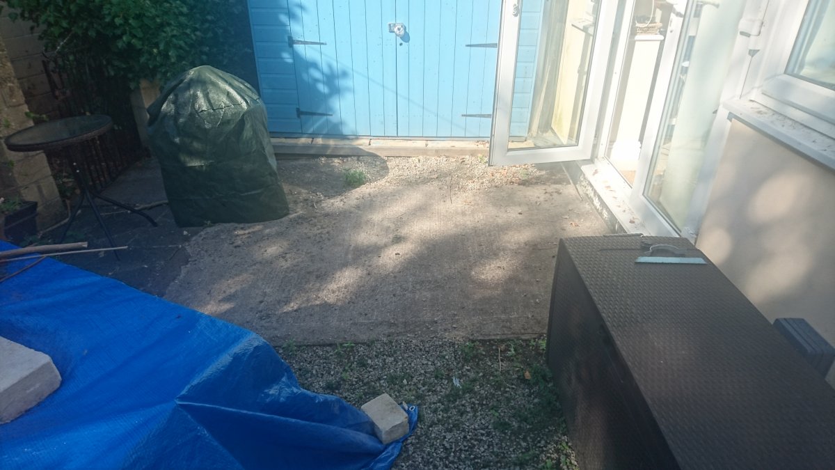Advice on best ways to proceed would be appreciated - for context, t he garden is on an L-shape with the extension taking up most of the space, the photos show the arm of the L towards the main house, facing the extension, facing along the extension, and a closeup of the shed base to show the slope and the state of the surface (plus state of our dodgy rushed paint job!)