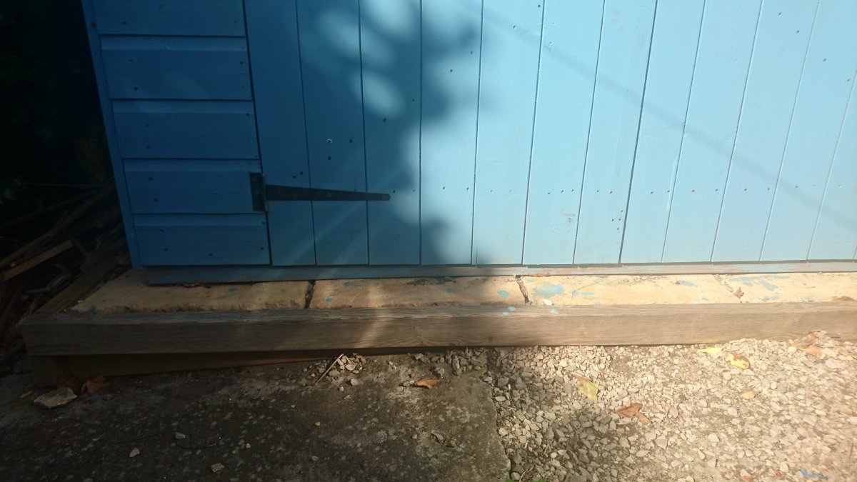 A slight complication is that we fitted a shed on a paved base on some screed (done as soon as we moved in as an emergency measure to get the bikes etc out of the house) but the shed doors would impinge upon decking - the shed base is not raised very far at all, and the doors would open over the planned deck/patio but the decking is likely to be too high. It's a bit hard to explain, so I attach some photos.