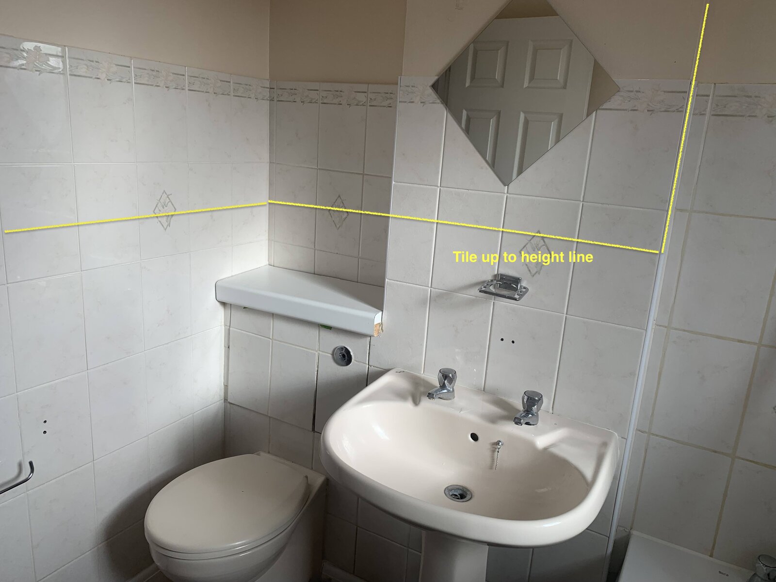 Yellow line in picture (side-1) will be the height of the new tiles. The bath area will have tiles going all the way up to ceiling instead