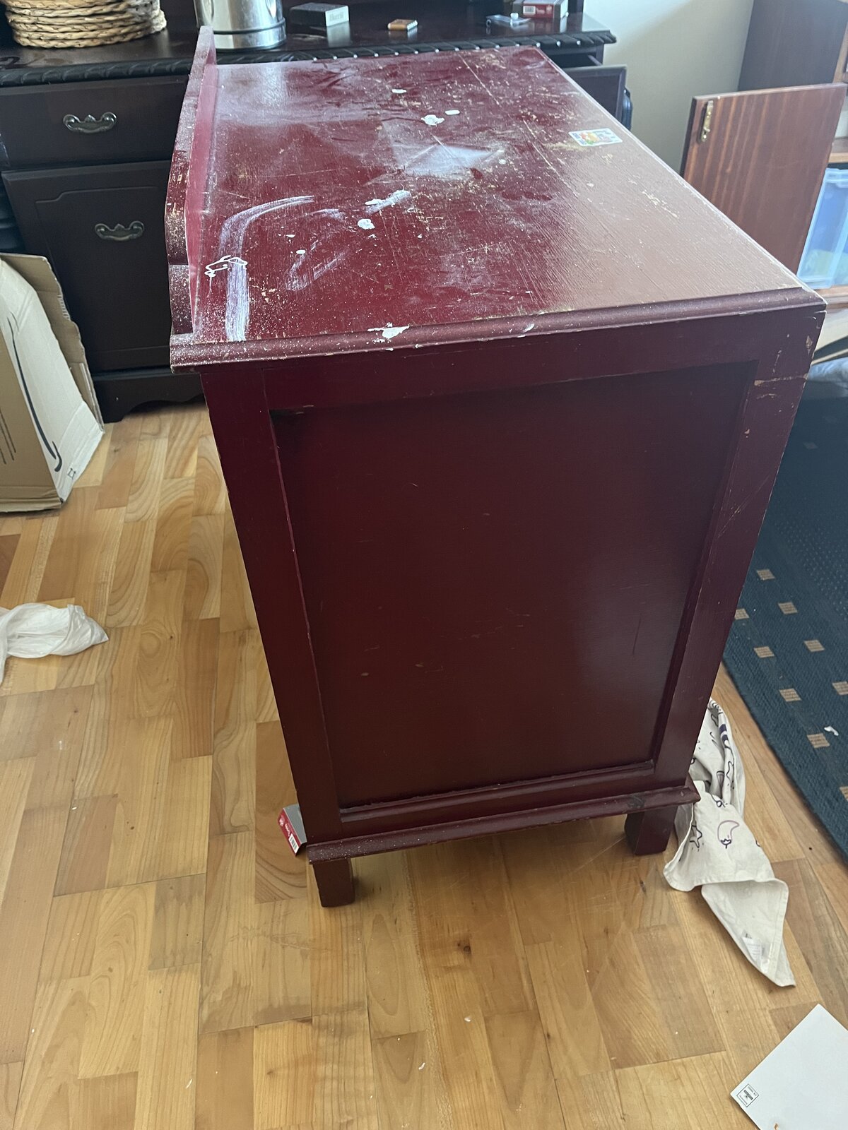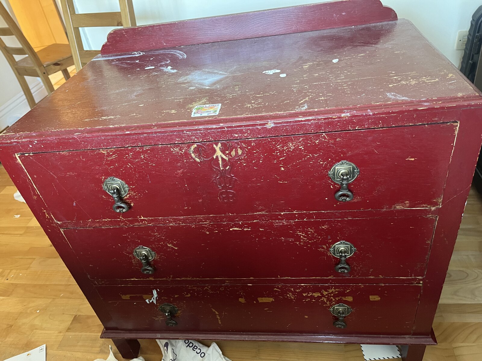 My plan is to use paint stripper to remove the thick maroon paint, then sand the wood down (is it worth/possible to use a power sander? ) before applying a couple of coats of varnish.
