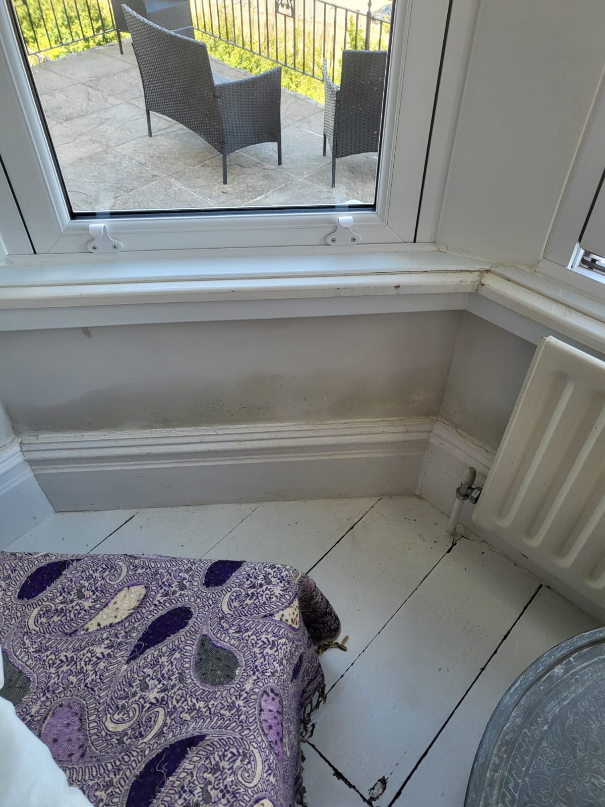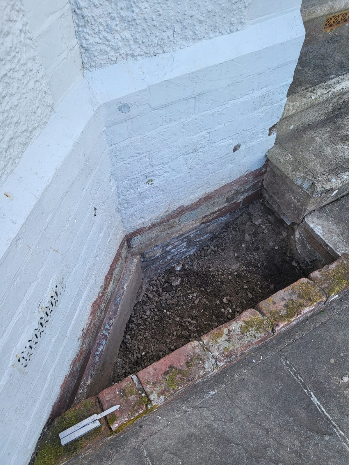 Hi. We have lived in our semi-detached Victorian house for 4 years, but over the past months we have had an issue with what appears to be rising damp in the ground floor bay. We lifted a floorboard and everything is completely dry. We have repaired a hairline crack on the window ledge and have just dug up an outside flower bed which was directly next to the exterior wall, below the damp area in the Bay - but the floor level is several feet above the flower bed. My question is what is the best option for the hole - we removed a large bush that had very deep, thick roots and now need to fill the hole in - should we replace the original soil or would it be better to fill it with gravel? I've attached photos of the damp inside and the hole and would be extremely grateful for any advice for the hole and what to do with the damp in the bay (which doesn't feel wet, just very stained). Thank you.