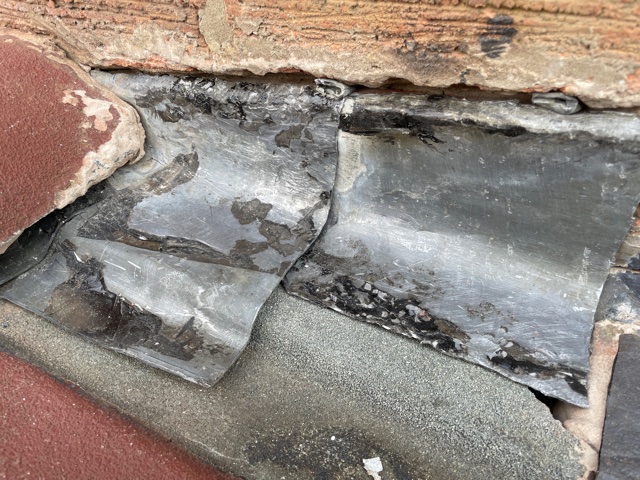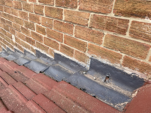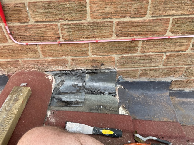 The roof in question is a late 90's built single storey extension with concrete tiles. around 5-10 years ago the main roof and extension were "refurbished" by a company - i.e. sprayed and botched! we've had a damp patch at the junction of the main house wall and extension for a while, upon investigation, found a couple of issues. Firstly, there was a hole in the flashing (helpful) - this I've patched with some flashband. the second is that some of the lead flashing just near the ridge tile looked loose - upon looking it is made of bits of lead flashing and the whole edge has been covered in flashband (quite badly it seems, as it's all lifting up!) I attempted a repair yesterday, and found the lead pieces used aren't wide enough to cover the gap between the roof tile and the wall and have a lip into the masonry - so they appear to have used flashing over the edge and sealed that into it...added to this all the ridge tiles are look as well - and it looks like there is a missing lead saddle...oh and the dry verge hasn't been installed properly so it appears to only be held on under the tiles. all in all a good job! Temporarily i've managed to reshape the pieces to go into the wall, and installed some flash band over it to cover the mess!
