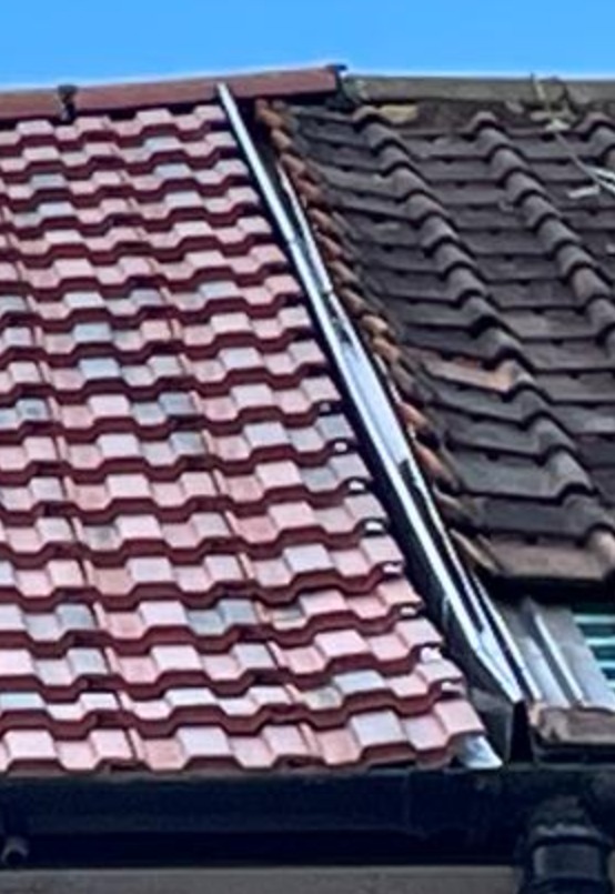 This year some tiles fell off where the chimney was. I had not seen any picture of the roof until this incident. (I did ask but forgot to follow up) Anyway Roofer fixed under warranty but said because my tiles were "old" they could not secure them 100%. As a result of this incident I've now seen a few pictures: It seems that my tiles have not been secured properly where they split the roof. Also the new ridgeline looks lower and they've perched a ridge tile across so it's flush on the neighbour's side but not mine.