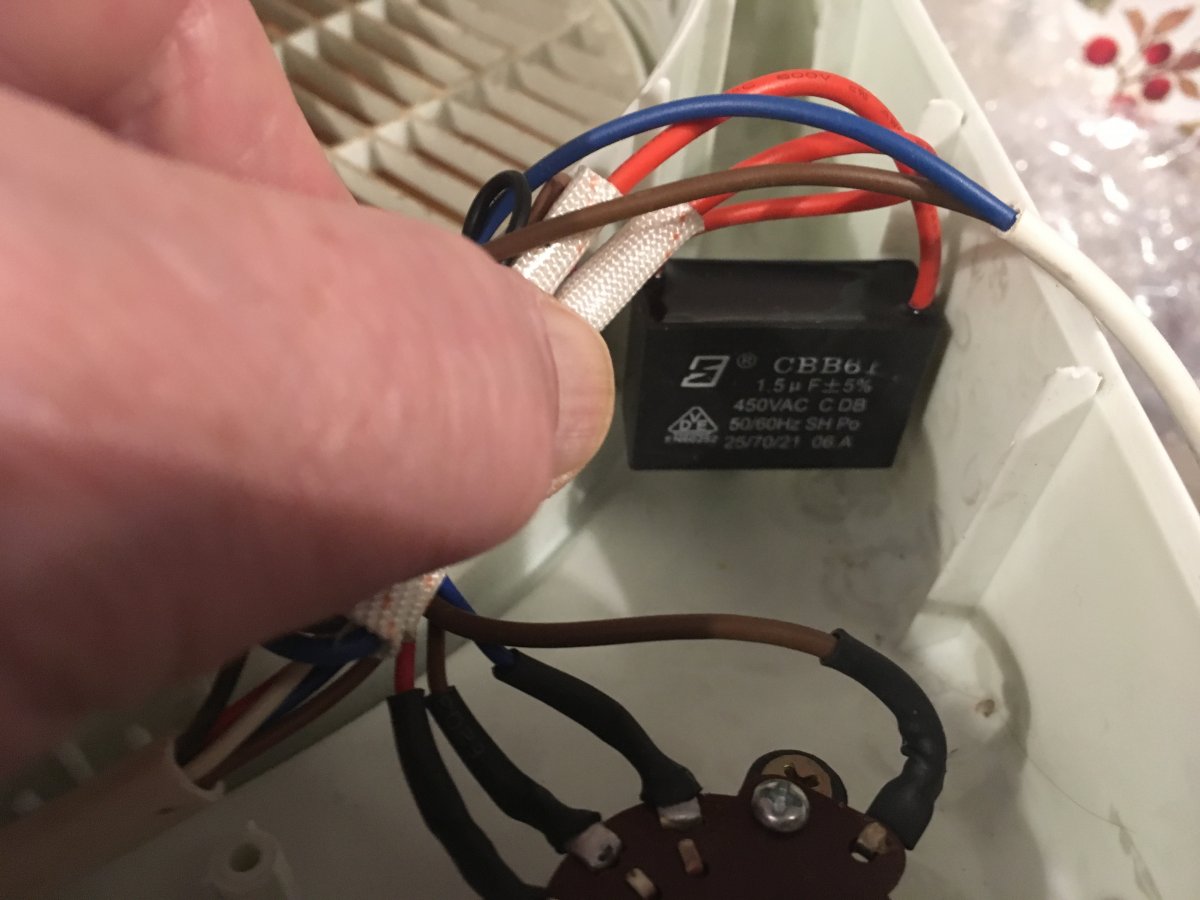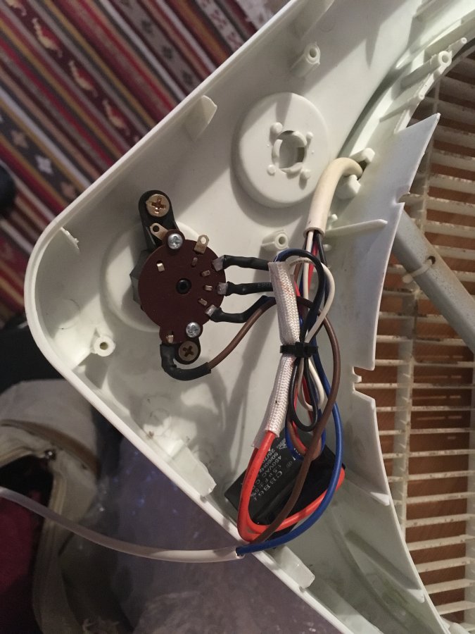 Opened up the fan and there's not much to see. A multi-gang switch to give three speeds and a large cap (which I assume is the starter cap?).
