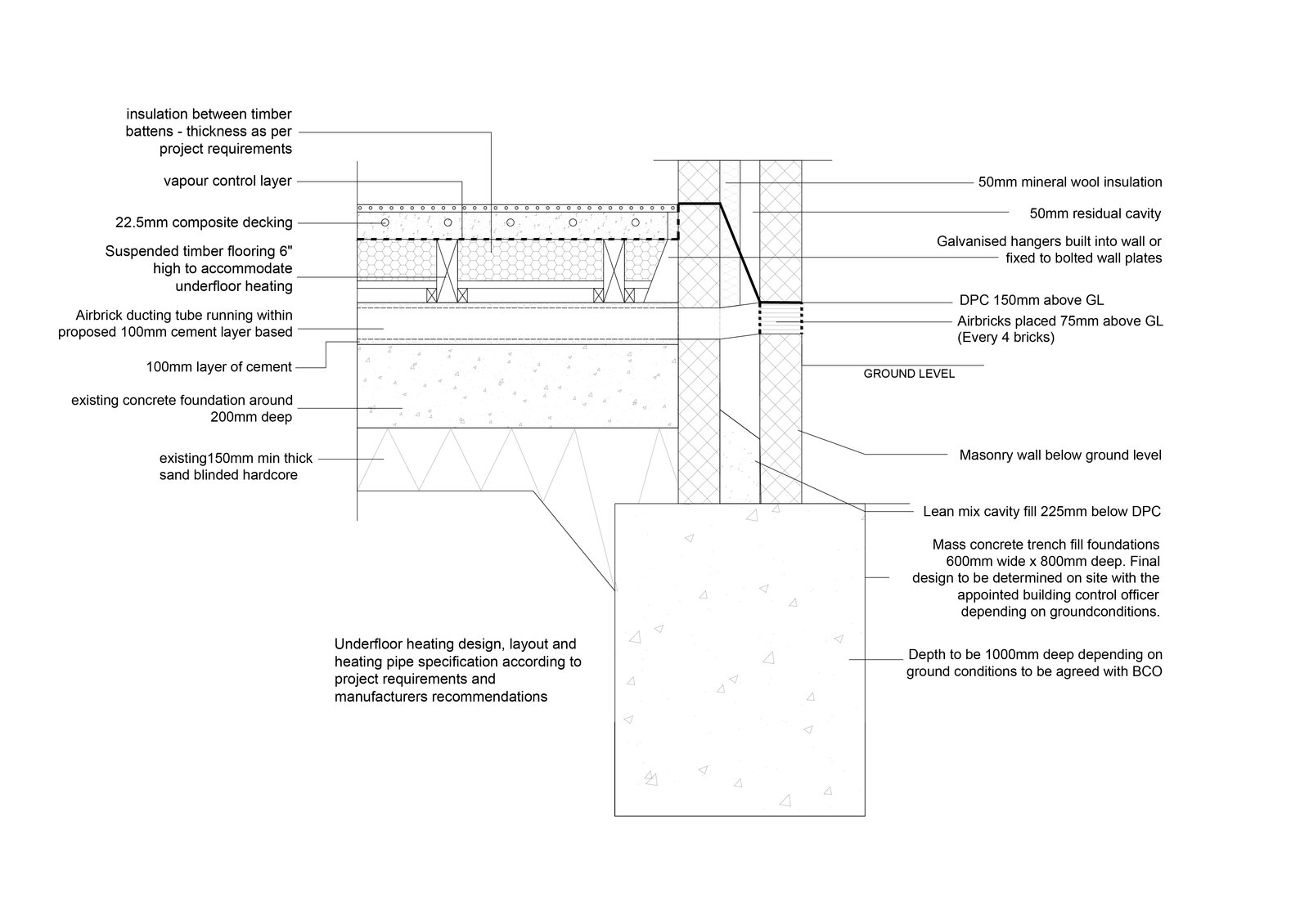 Then, the other amendments regarding the construction is that weep holes are unacceptable as need to be replaced with airbricks. If we are going to use airbricks in the extension - does this mean we need to create 150mm void cross ventilation for a timber suspended flooring or does this need an airbrick ducting tube to run across either within the insulation with timber joists to within the new layer of cement to be connected to the existing wall? The idea was not to have 150mm air void because its too high in terms of levelling with the existing dwelling.