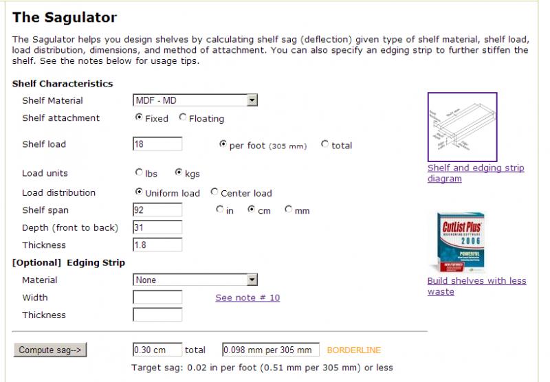 My question is that from what little I know of DIY it seems that these thicknesses should be adequate for non-sagging shelves. Is the sagulator showing what it is showing because it assumes that the shelves will be supported/attached only on the 2 sides but not at the back? (for e.g. if you were to use shelf brackets).