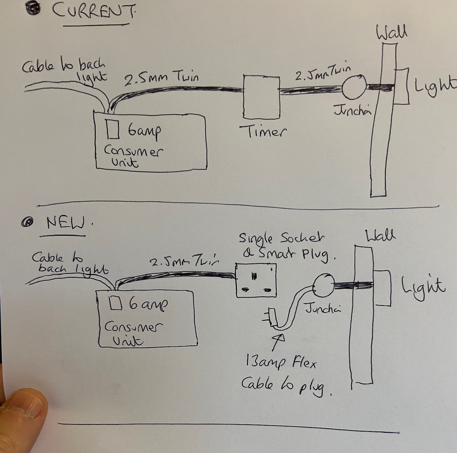 Hi, looking for some advice about our outside lights please. Our consumer unit is in the garage that is attached to the house. It has an RCD and a dedicated circuit for the outside lights with a 6A MCB. The front light is wired back to the consumer unit via a time switch which has been there for many years but has now gone wrong. I was thinking about replacing the timer with a single 13A socket and smart plug and wanted to check if this is an acceptable arrangement and something that I am allowed to do myself. I have attached pictures showing the current and proposed new arrangement and would really appreciate any advice. Thank you very much for your help.