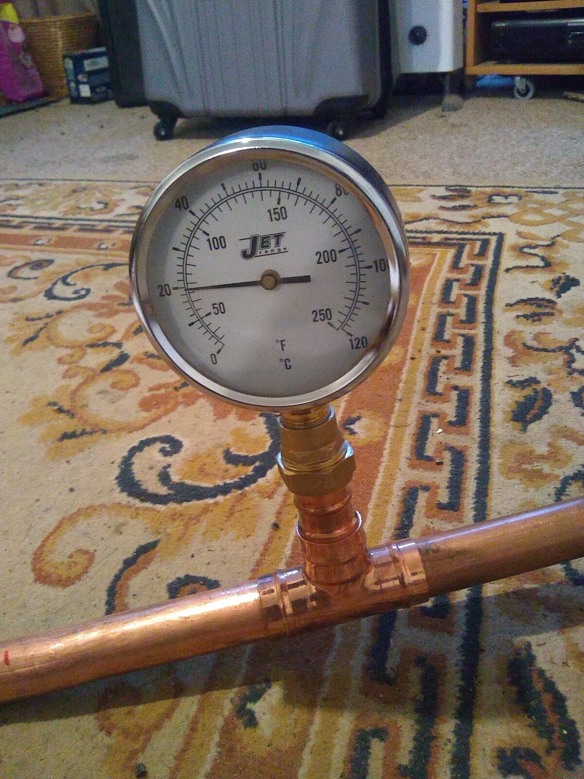 to the flow from the woodburner to the thermal store. I don't really need to but I've got it and I like gauges (there'll be a pressure gauge going next to it for very similar reasons).