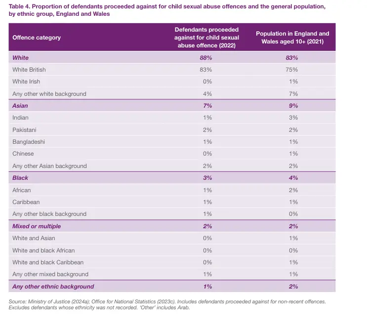 Not true see table 3In 2022/23 for example there were 17'800 rape offences committed upon children and 91% of those offences that year, committed by white British men. In the same year 85% of ALL group based rape gang offences were committed by white British males.