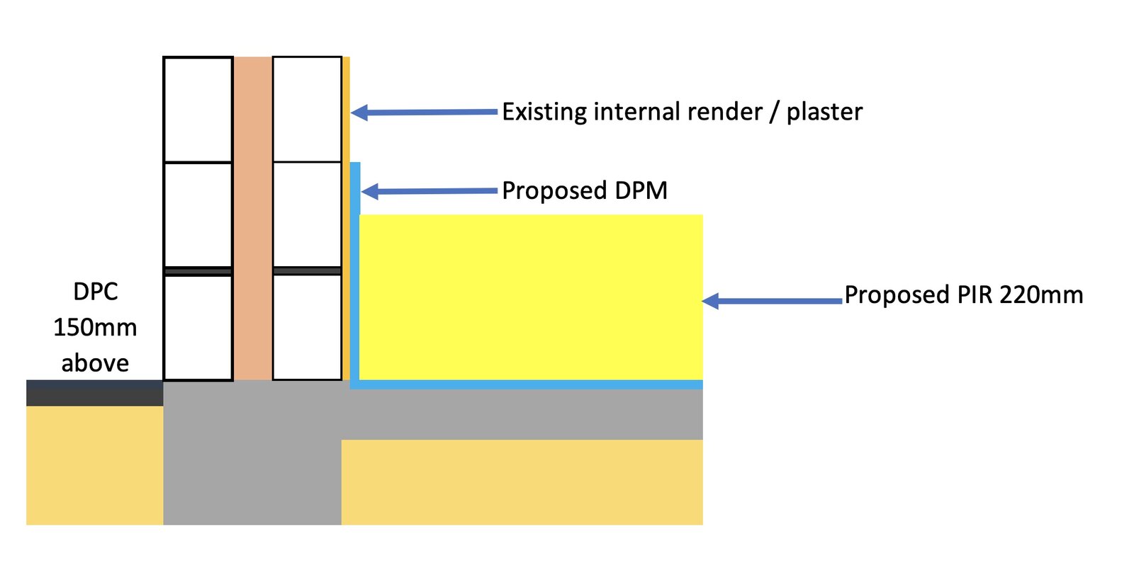 (Edited to make more sense) Regarding the other existing 2 internal and 1 external walls - from the attached sketch - it's a 70's bungalow and I've had to assume what I can't see going on below - but is there an issue that the internal render / plaster looks to bridge the inner DPC and then if we lay the new DPM how best would we finish it off coming up the wall bearing in mind walls will be reskimmed and the small length of external wall section is having an additional layer of insulated plasterboard, then skimmed and skirting.