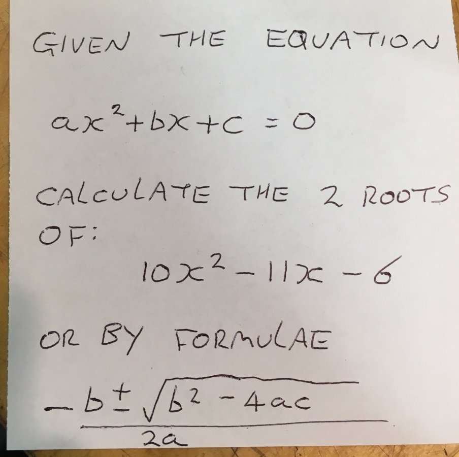 For the equation 10x²-11x-6=0, the roots are 1.5 and -0.4, using the standard formula for the solution of a quadratic (as shown above)