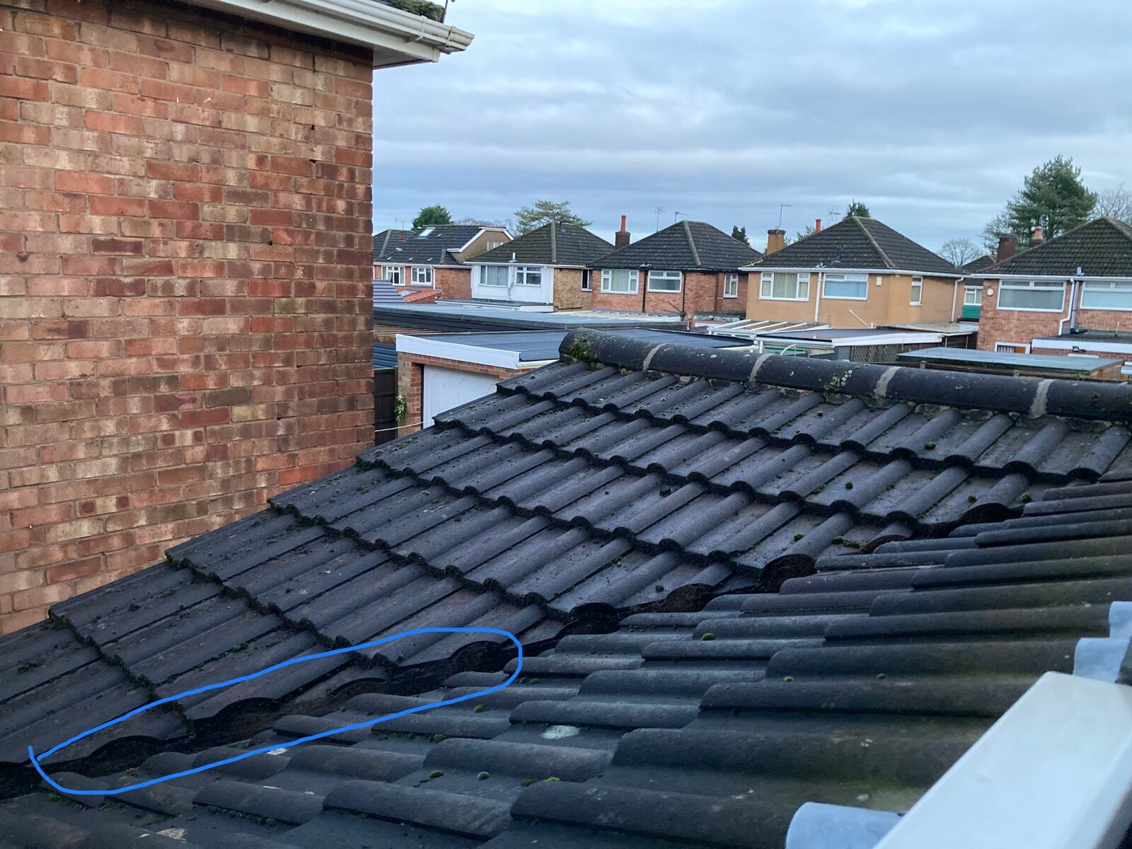 From the outside, the roof looks OK (to me anyway). Difficult to tell exactly where it is, but I think the ripped membrane would be somewhere under the middle of the roof area that is visible in the photo below, on the far side of the valley. The valley itself appears to be fibreglass, is approx. 17 years old, and has no obvious sign of damage.