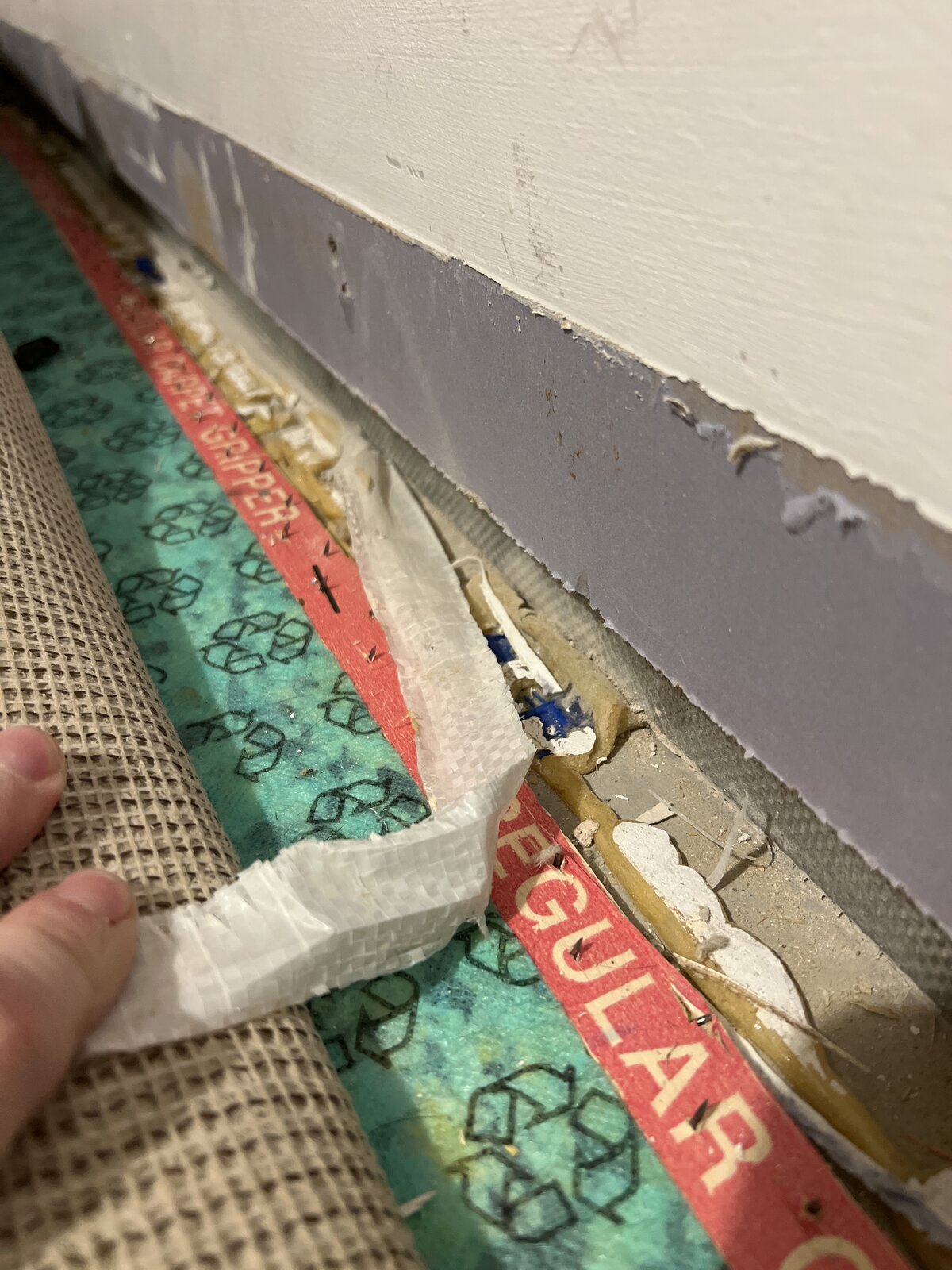 Roll on to now and I’m removing the carpet in the room and find that what they actually did was just wedge some filler pieces under the metal stud base plate and put some glue around it.