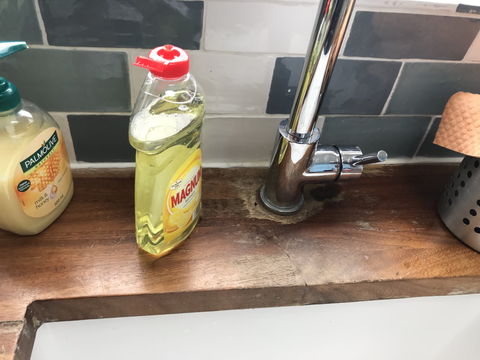 10 year old iroko, in need of a bit of TLC. Planning to rub down and re oil the whole lot, but is there anything I can do to make the discoloured area around the tap a bit less noticeable? Thanks for any advice...