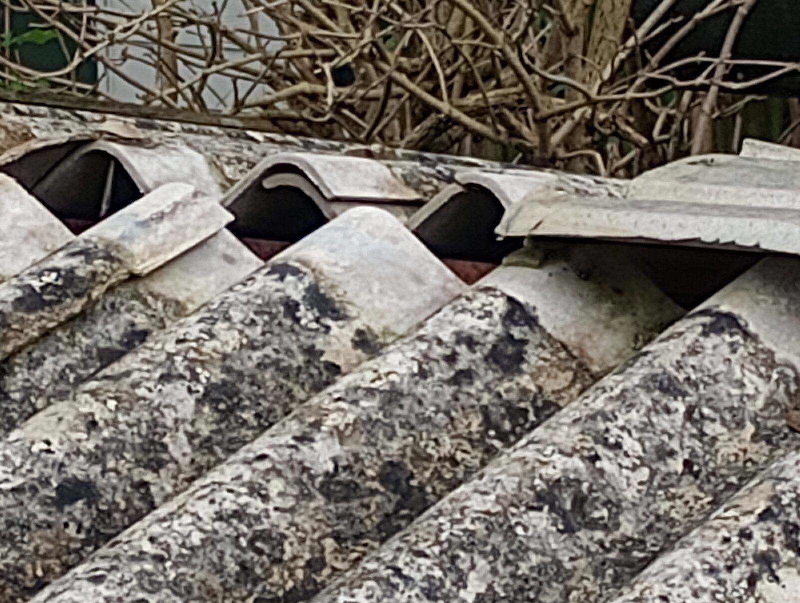 Hello. My garage roof has a big gap suddenly appeared. I'll add a picture. It's corrugated probably asbestos and a bit has disappeared along the ridge. Is there anything I can do for now like tape a sheet of something over the hole. If so what kind of tape?